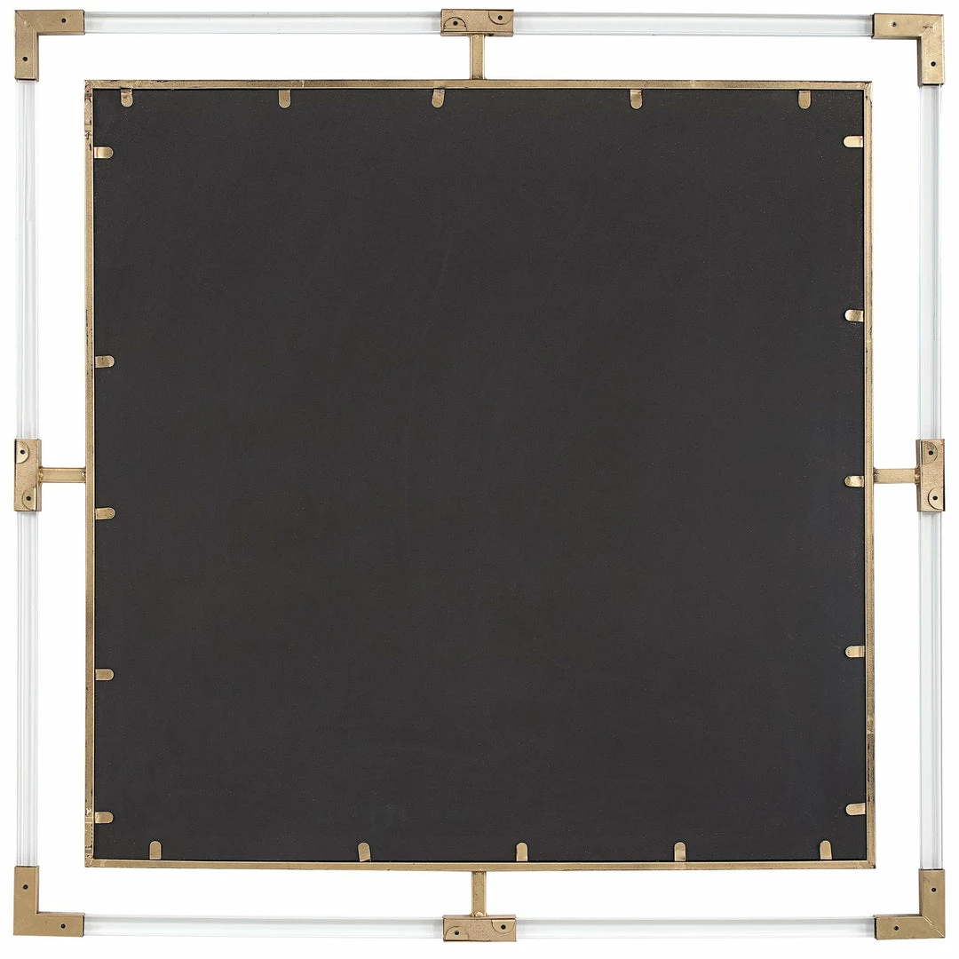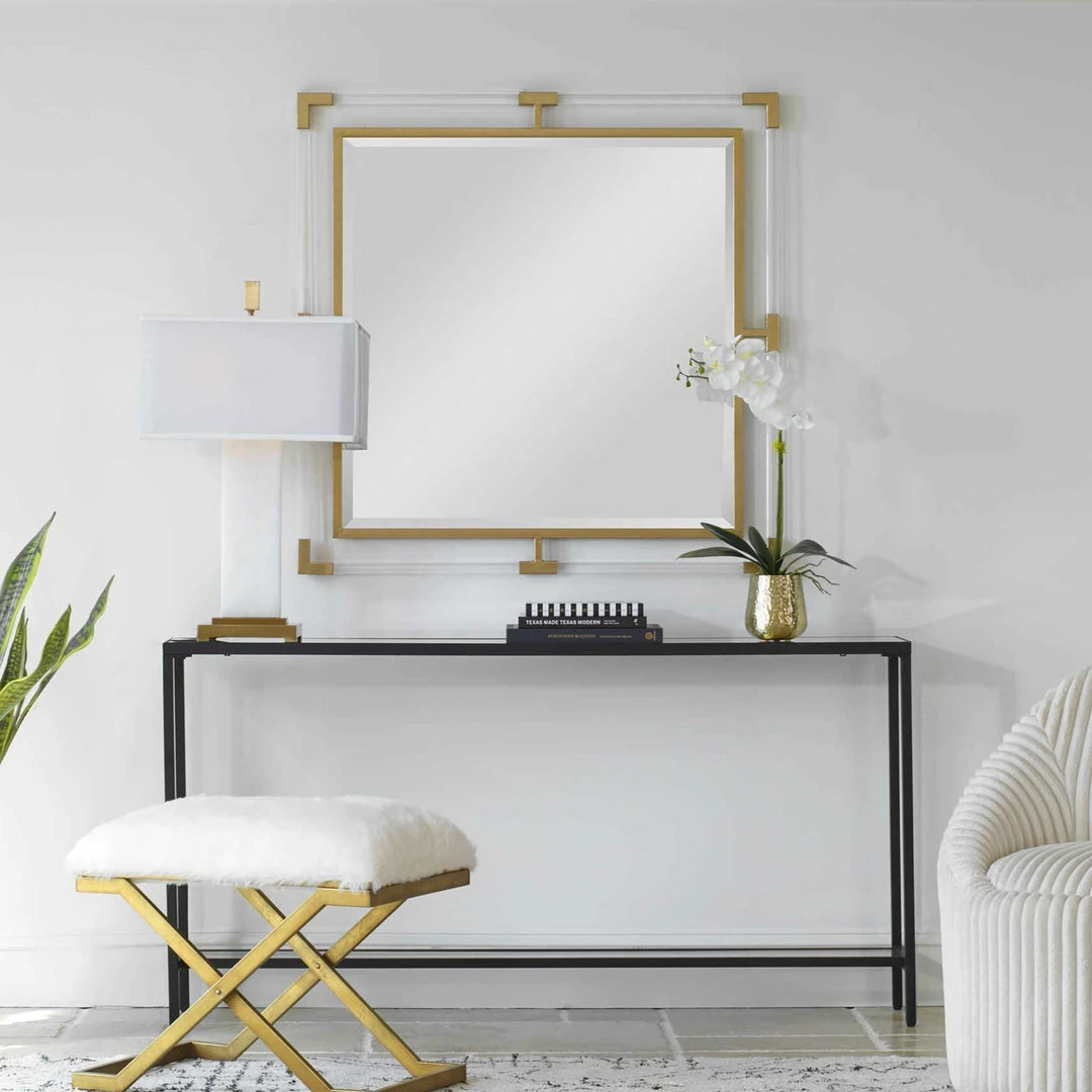 This mirror can certainly serve as a focal point for any room. Combining forged iron finished in a metallic gold leaf, with suspended, clear acrylic, solid bars creating a modern feel. Mirror has a generous 1 1/4″ bevel.