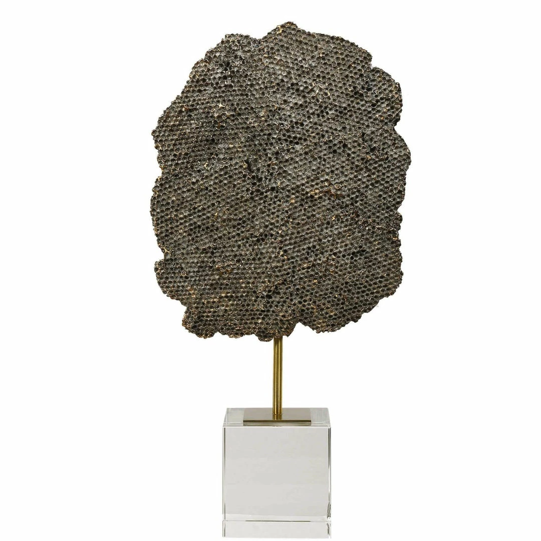 Inspired by a natural honeycomb, this sculpture showcases intricately carved details finished in antique gold and accented by a crystal foot.