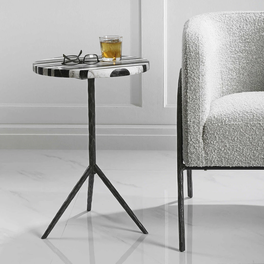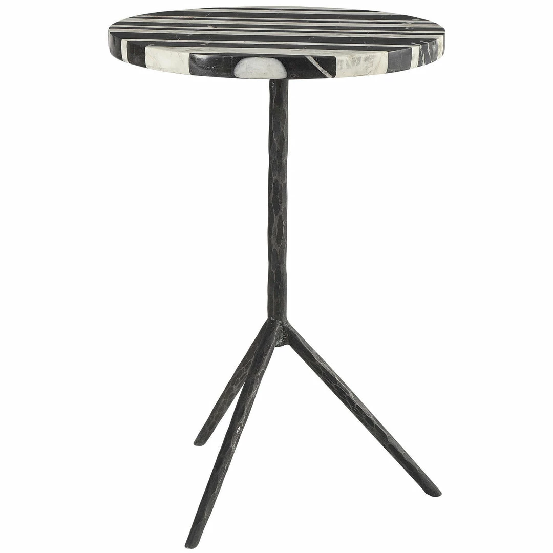 A unique blend of classic and modern details, this round accent table showcases an asymmetrically striped black and white marble top over a chiseled iron tripod base in a naturally distressed aged iron finish.