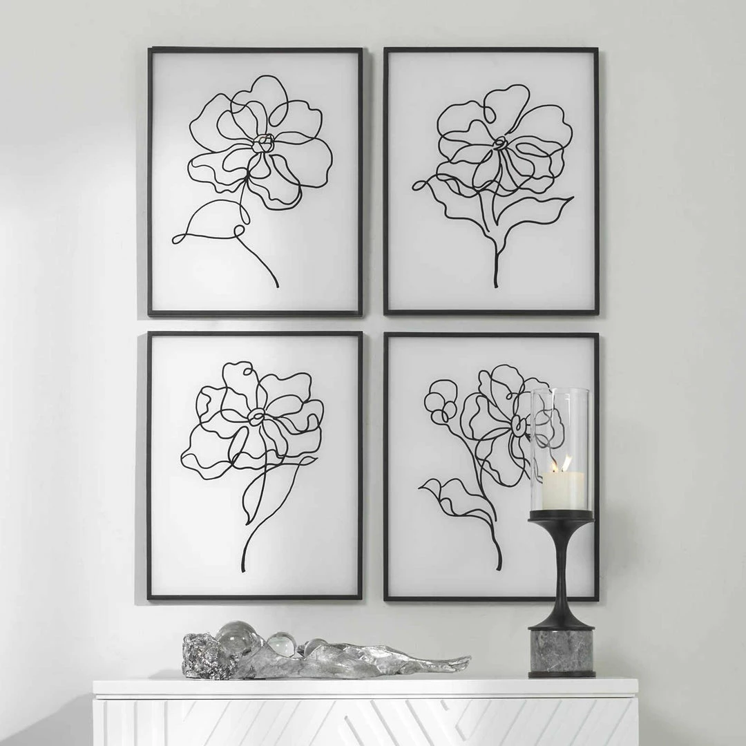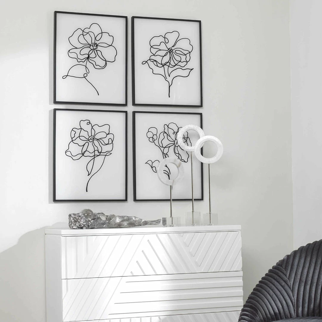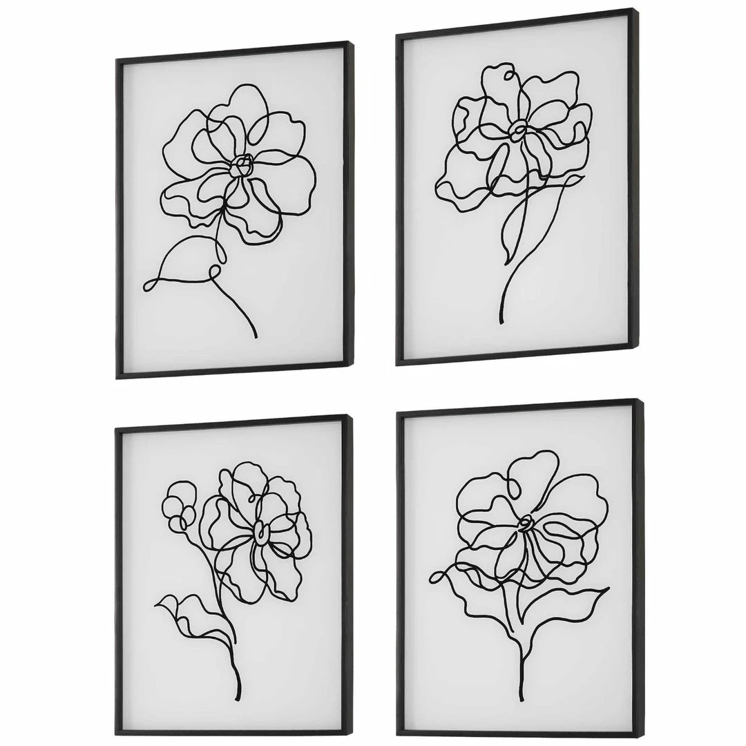 Simple yet elegant, this artwork makes a beautiful statement with a classic black and white palette. Each modern floral sketch is executed on painted white glass with a slim black frame.