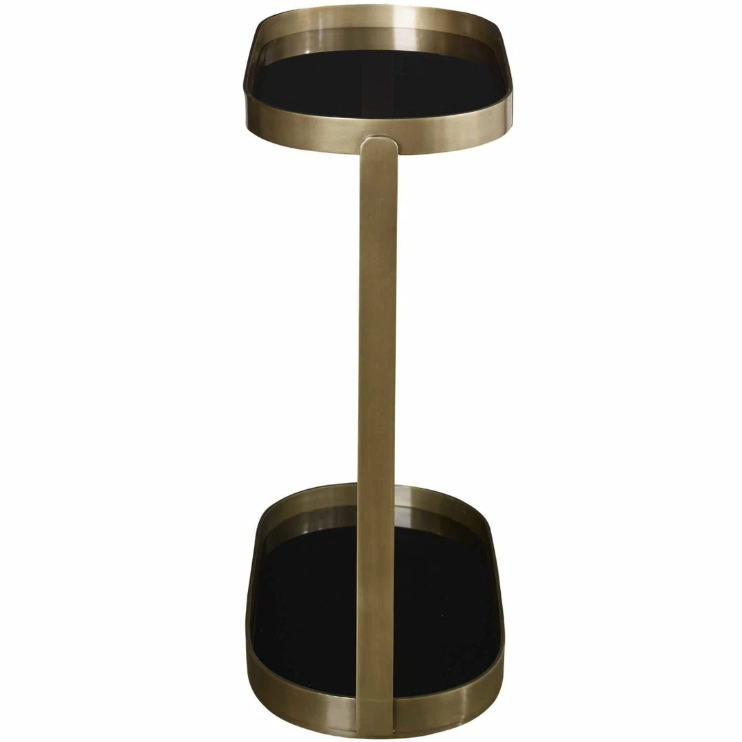 Simple lines withΒ Mid-Century styling, this thick stainless steel side table is finished in brushed brass with black glass inlaid shelves.
