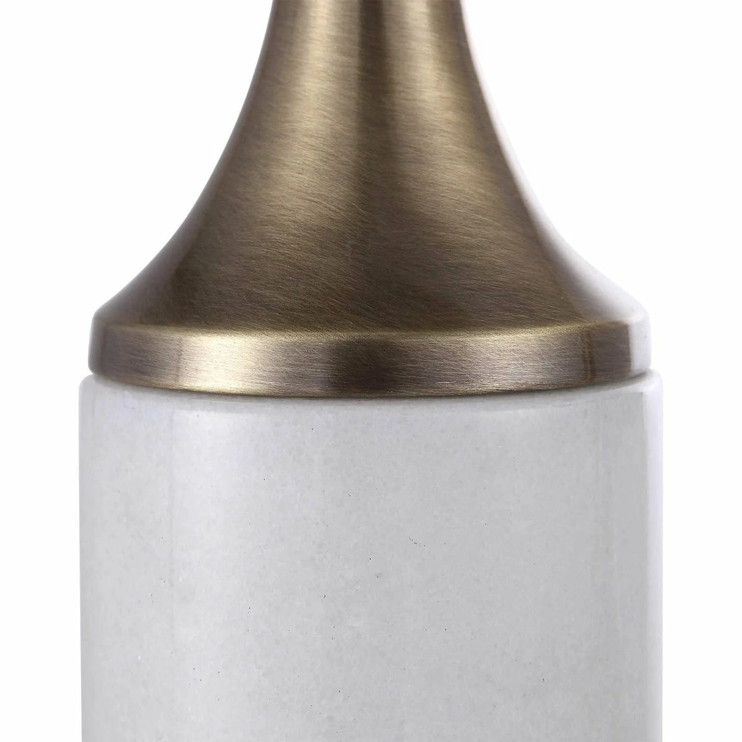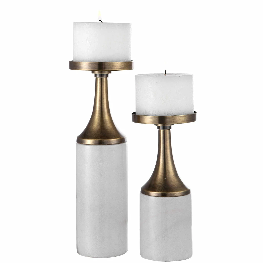 Set of two candle-holders feature an antique brushed brass finish and an elegant white marble foot.