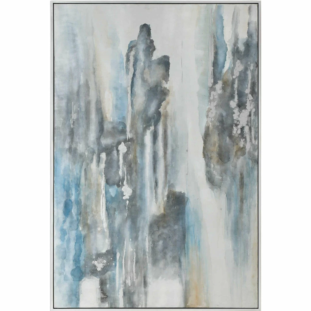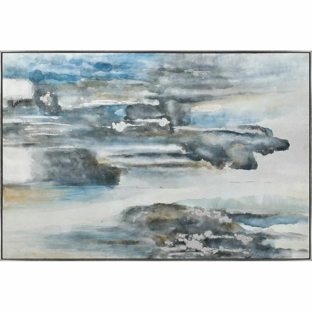 Abstract in style, this modern, hand painted artwork on canvas features muted, on-trend shades. Mottled hues of blue and gray are paired with charcoal and cream tones. Each canvas is stretched and attached to a wooden frame, then surrounded by a petite, silver leaf gallery frame.