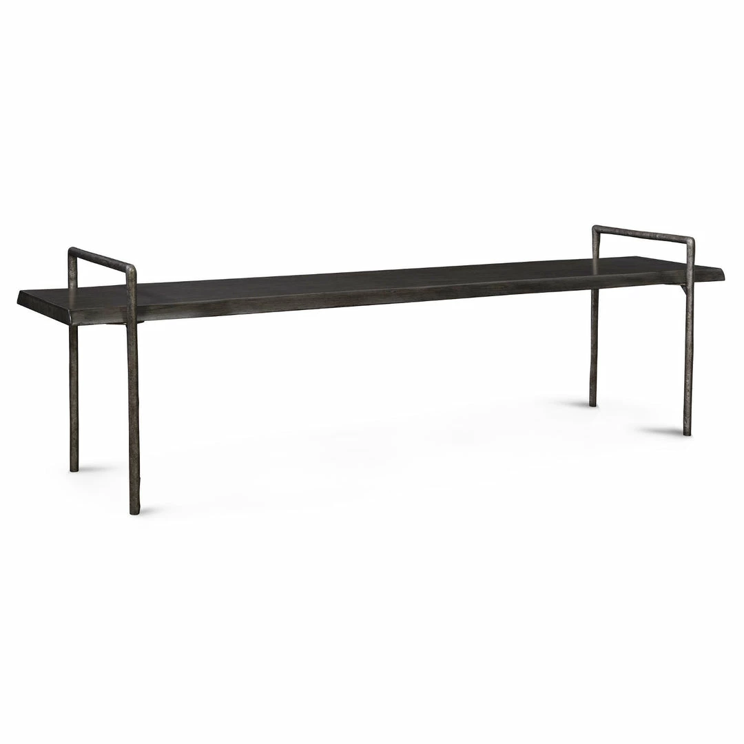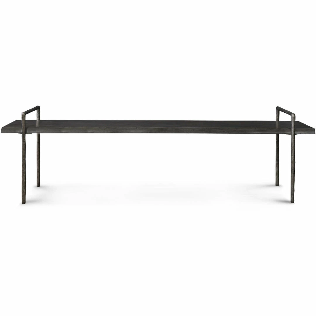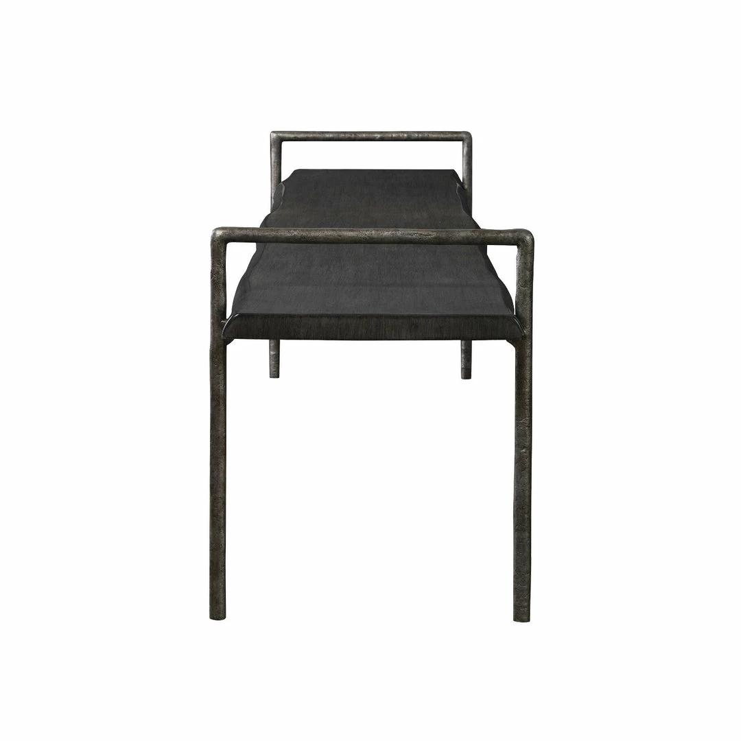 Perfect for dining, entry or at the end of a bed. Chandos features modern lodge styling with a live edge look solid acacia wood seat stained in a dark gray. Finished with an organically textured tarnished silver iron frame.