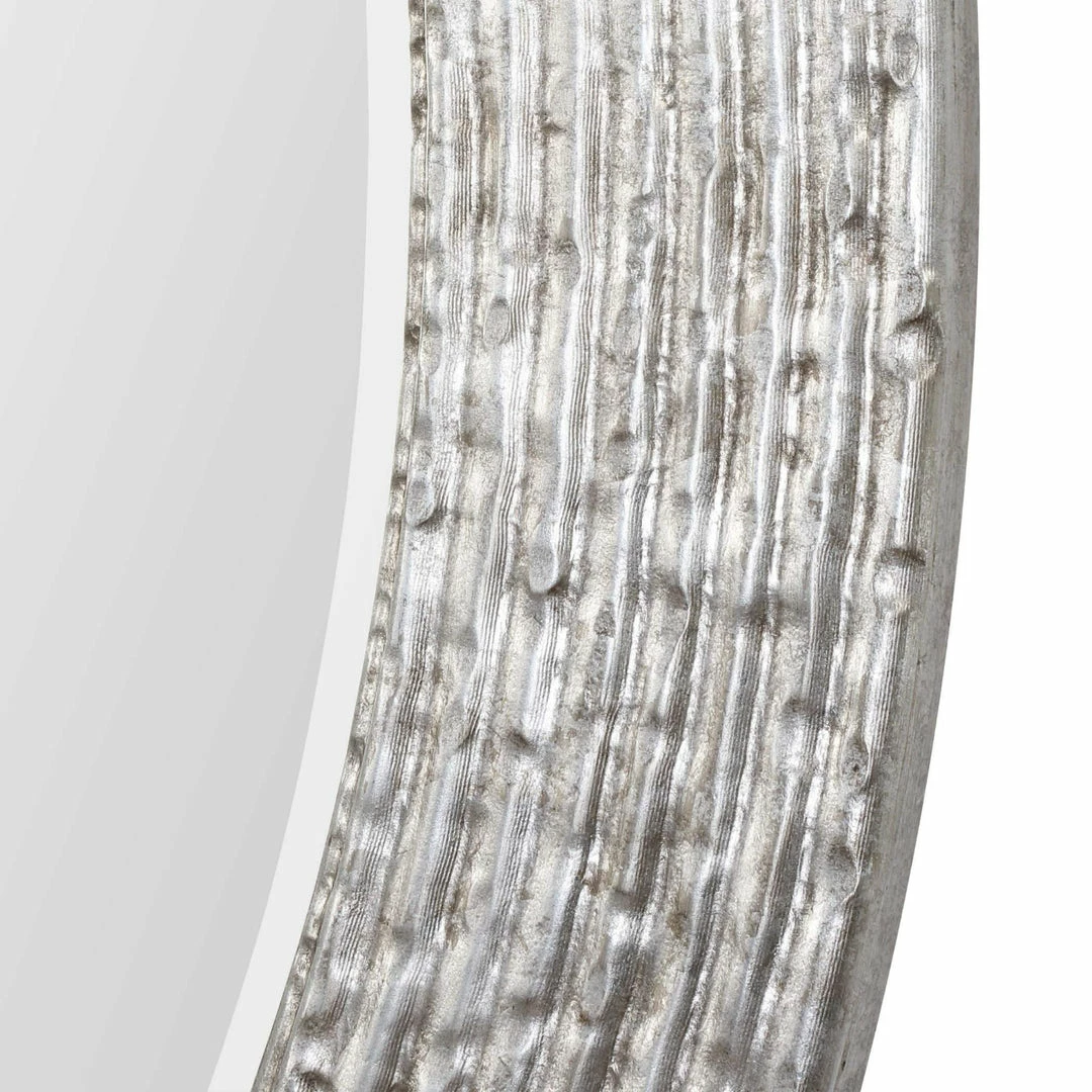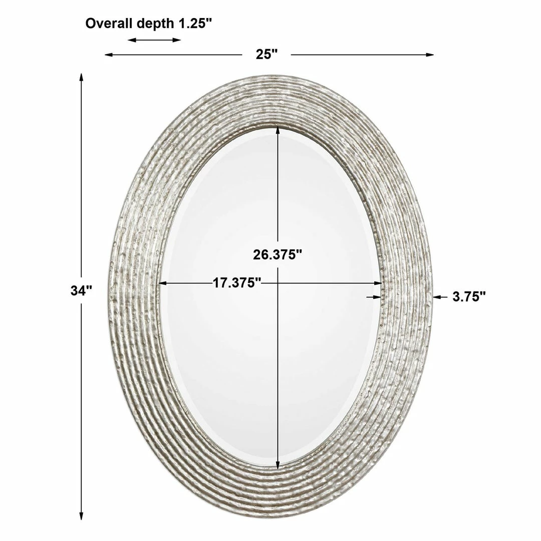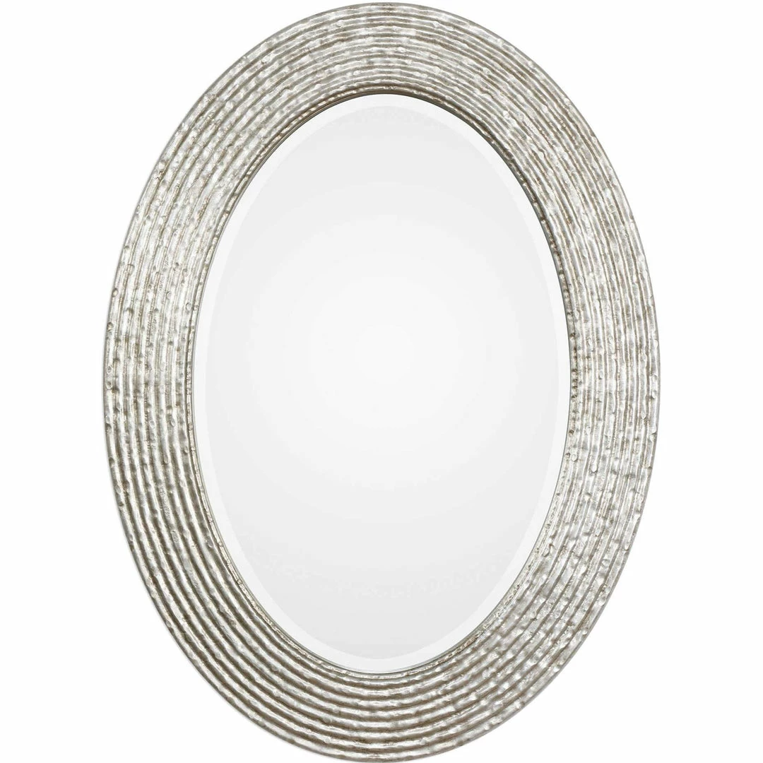 This oval framed beveled mirror features a reeded surface with a hammered texture and a burnished silver wrapped finish.
