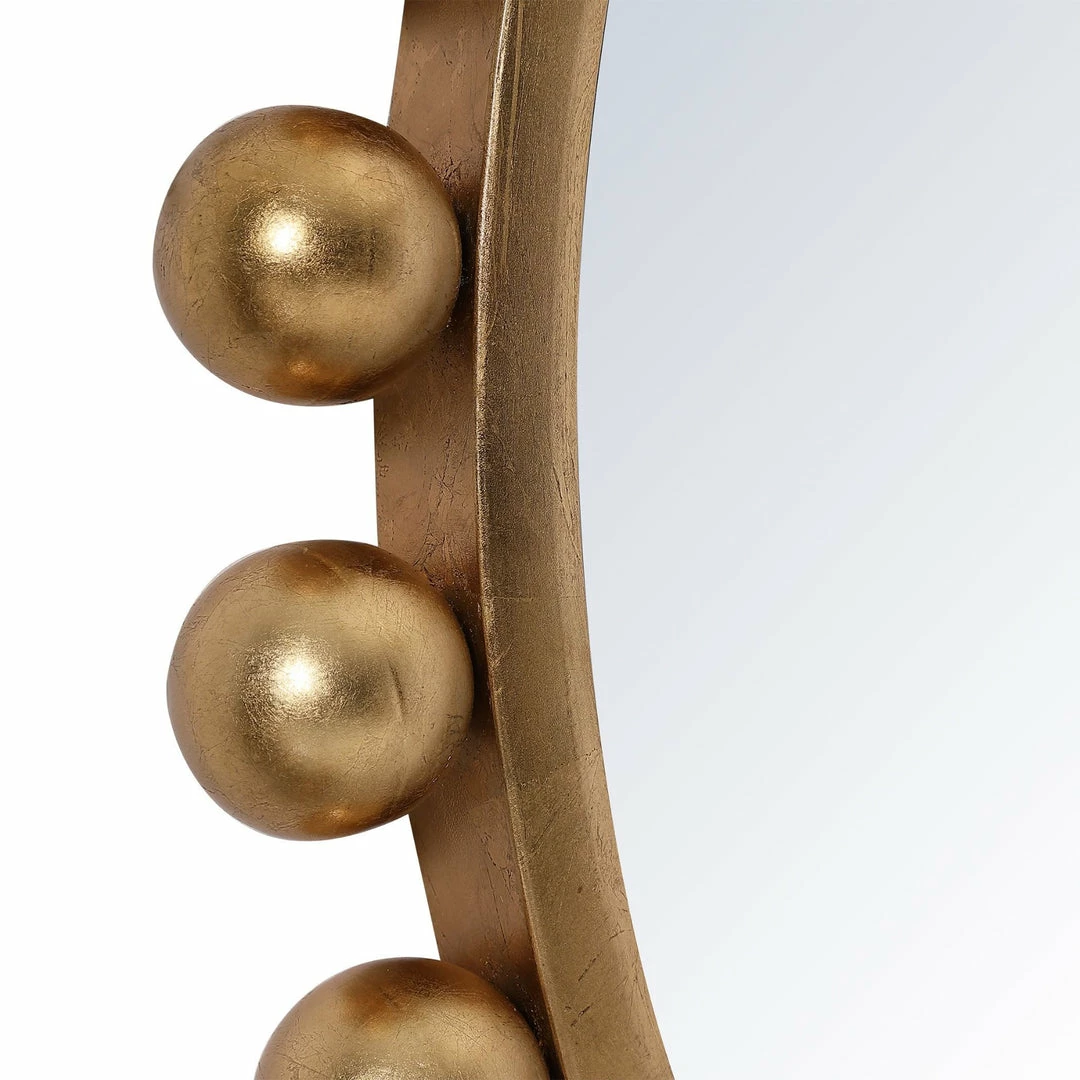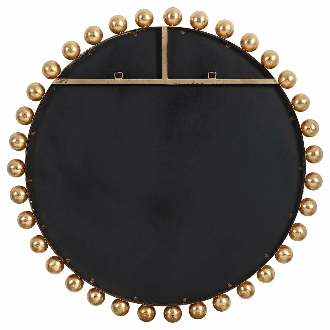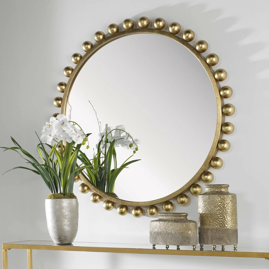 This eye-catching round mirror adds an upscale look and sophisticated style to any room by showcasing smooth iron spheres that embellish a sleek inner frame, finished in a clean metallic gold leaf.