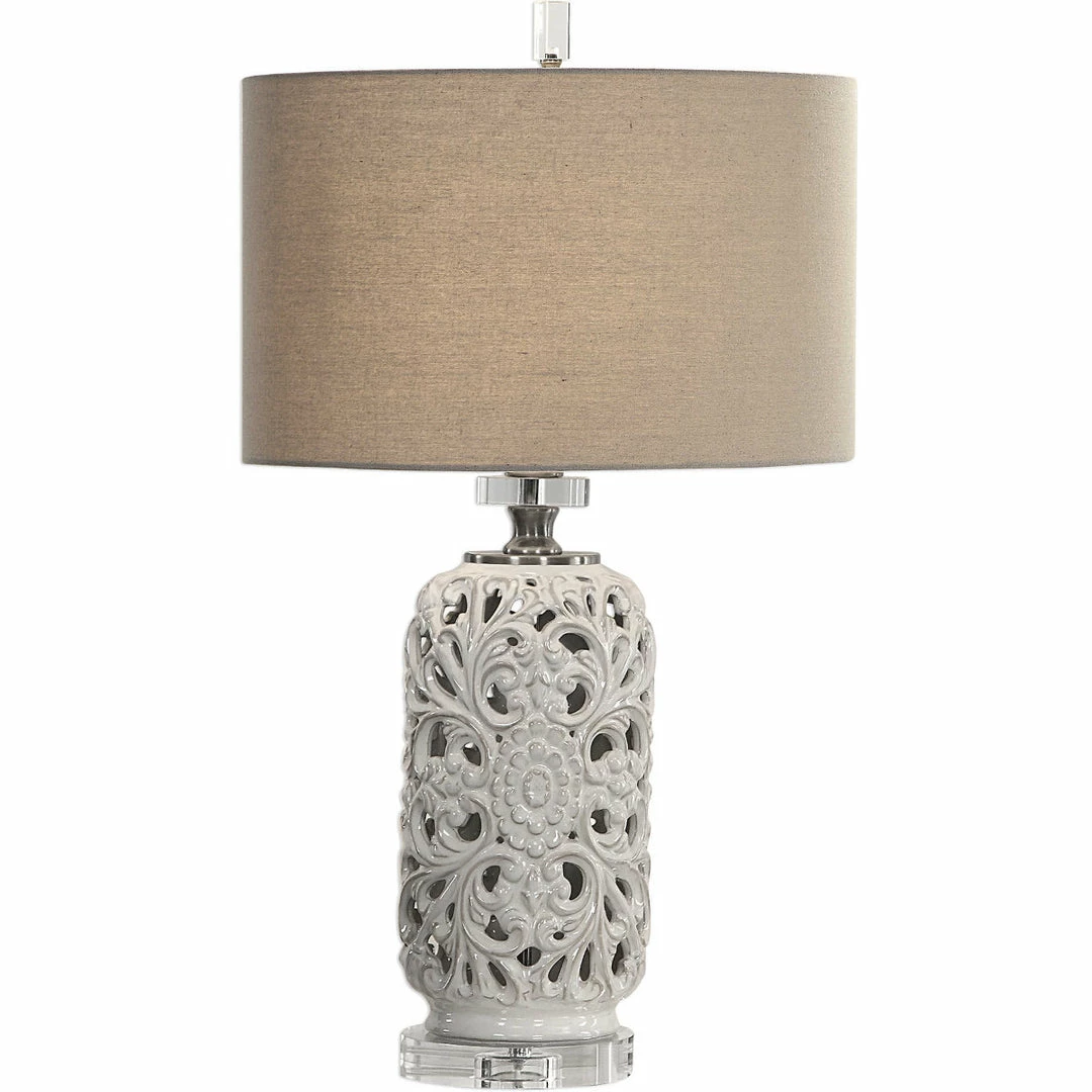 Updated styling to a traditional design, featuring pierced ceramic with decorative embossing, paired with thick crystal details and plated brushed gun metal accents. The round hardback drum shade is a light gray linen fabric. Due to the nature of fired glazes on ceramic lamps, finishes will vary slightly.
