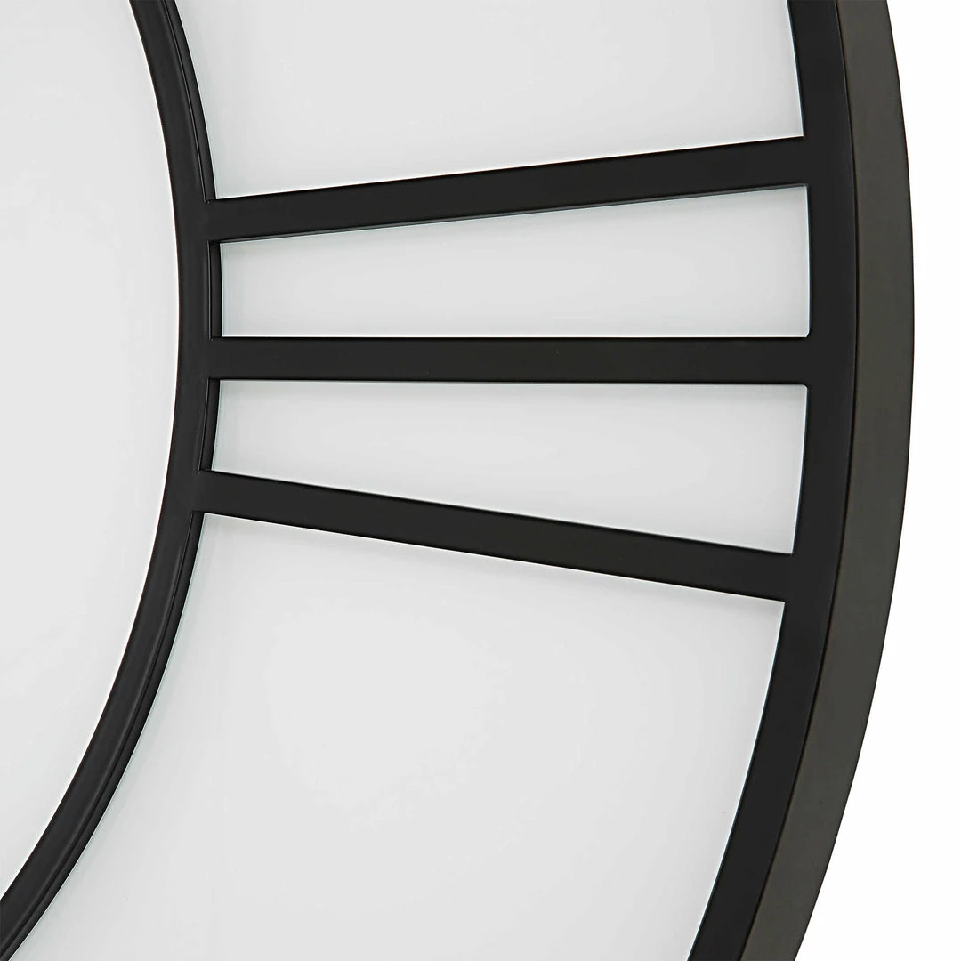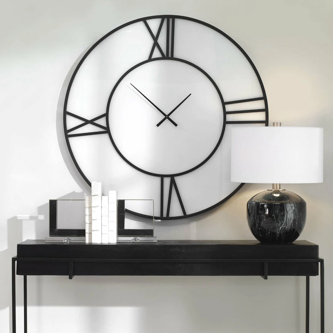 This modern style wall clock features a matte black frame and a white glass face. Quartz movement ensures accurate timekeeping.