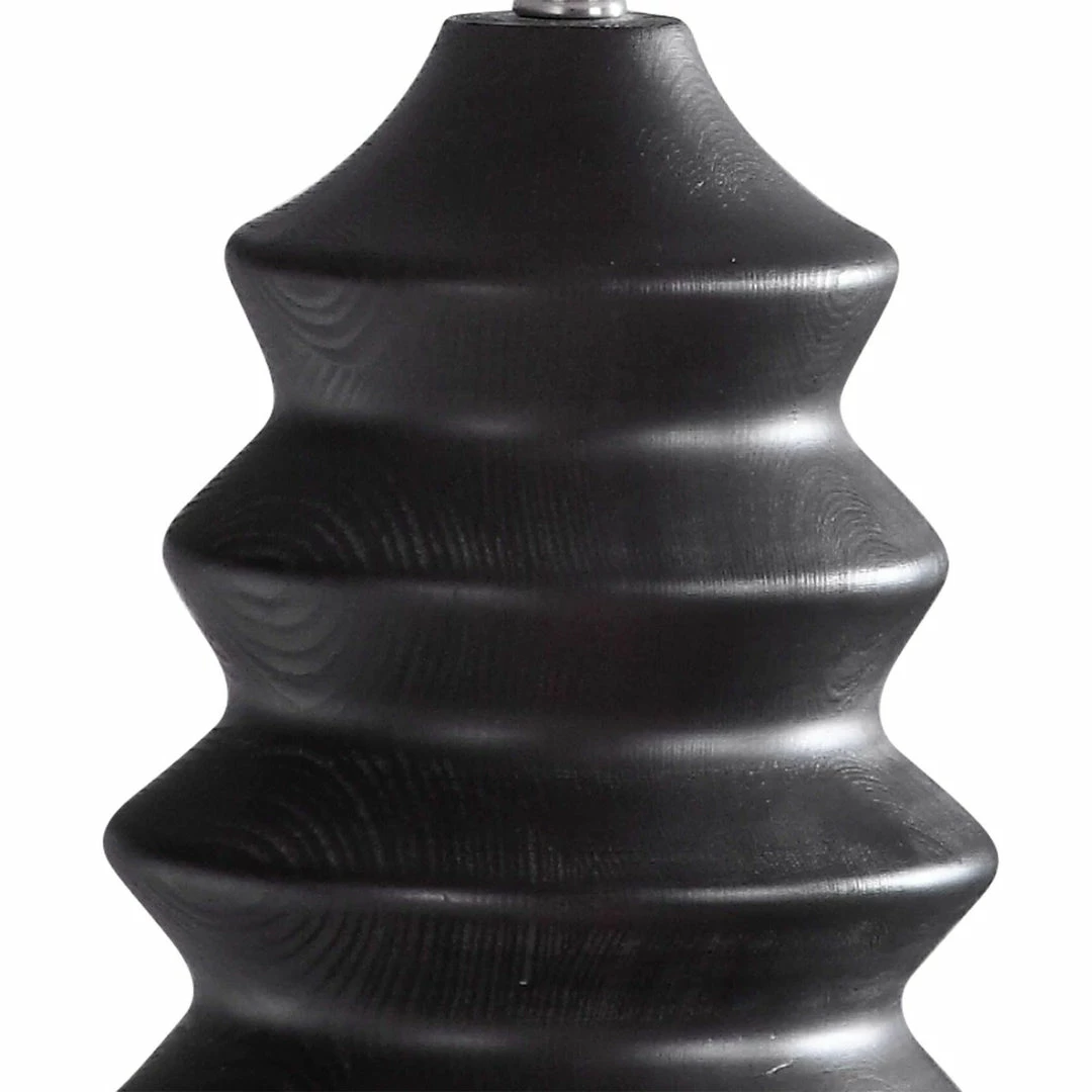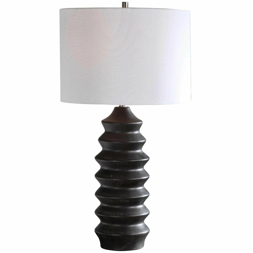 Showcasing a modern lodge style, this table lamp features a carved wood base finished in a rustic black stain exposing subtle wood grain. The lamp is paired with a round hardback drum shade in a white linen fabric.