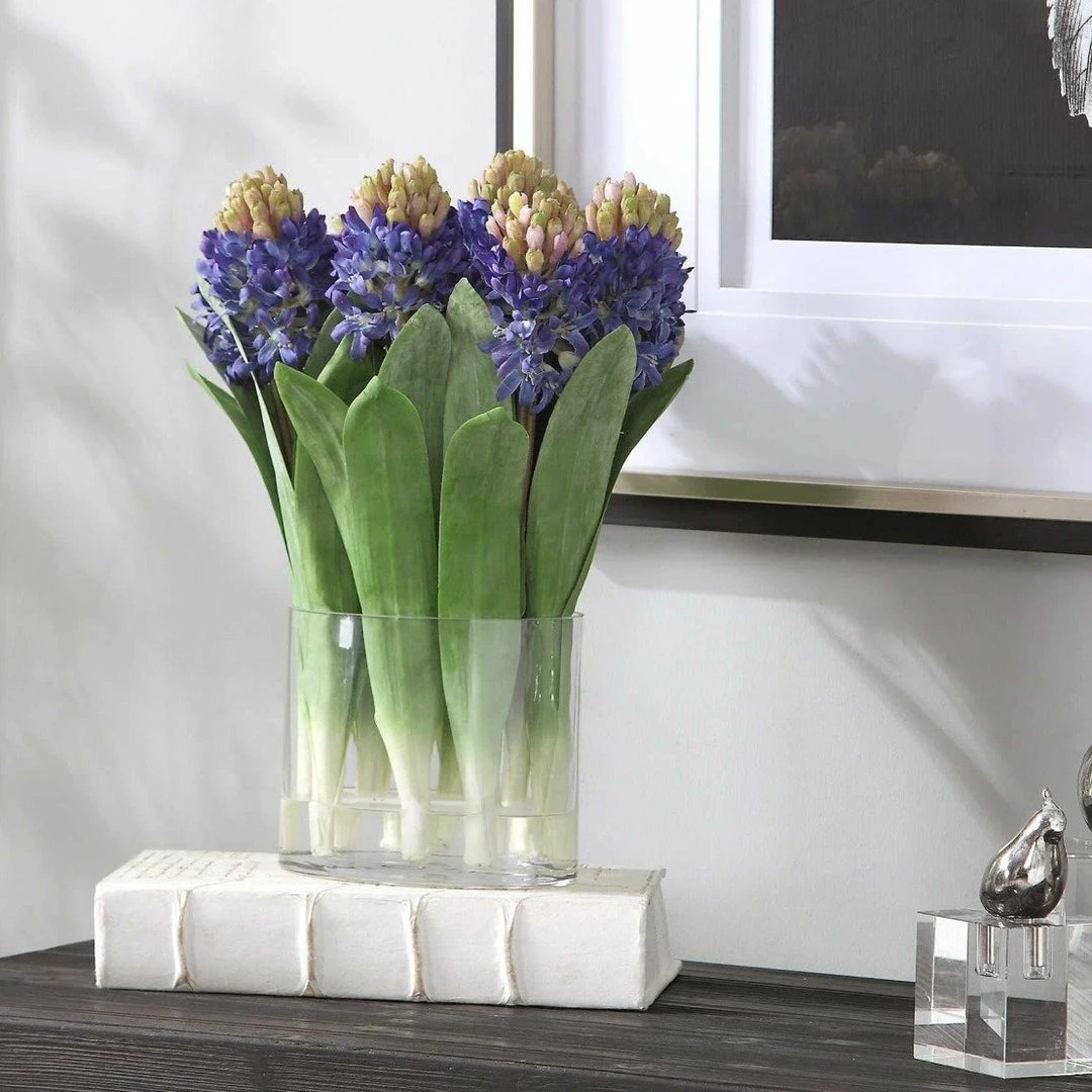 Displaying life-like characteristics, this silk arrangement features vibrant Mediterranean blue hyacinths neatly arranged in an oval glass vase with faux water.