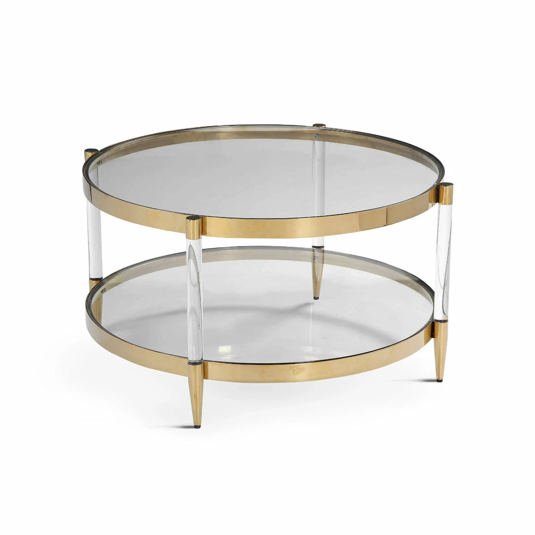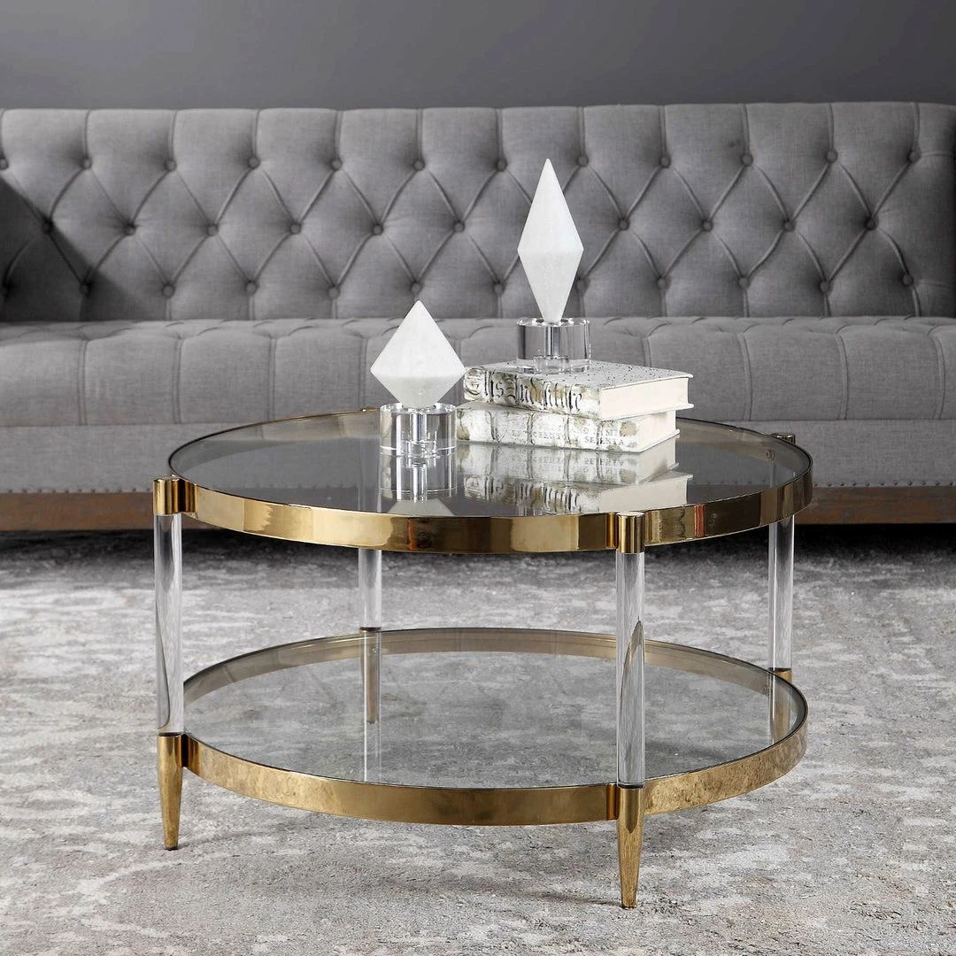A true glam accent, the Allure Coffee Table features a gold plated stainless steel frame with clear glass, acrylic legs and tapered feet.