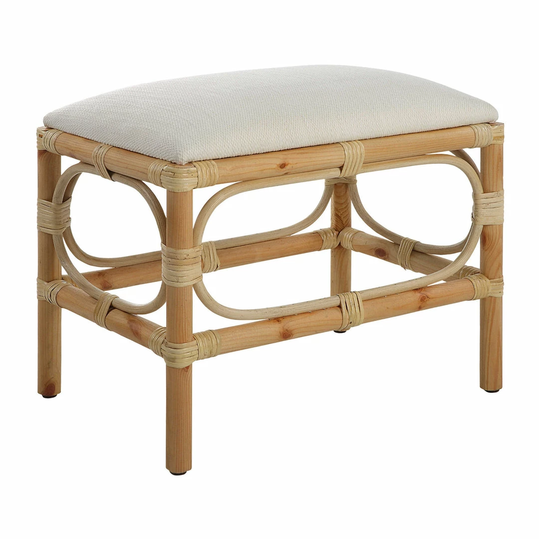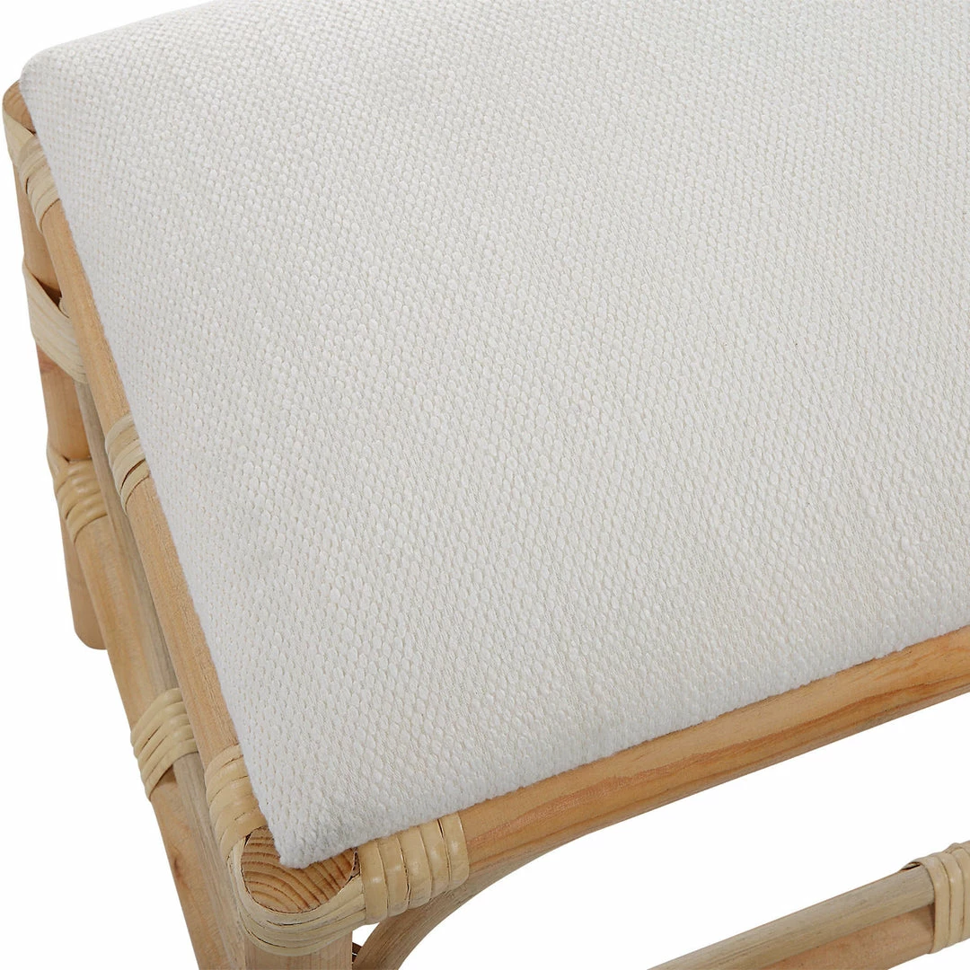 A refreshing coastal accent featuring a crisp white textured fabric, over a naturally finished solid wood base with rattan wrapped accents. Perfect doubled up at the foot of a bed or under a console table.