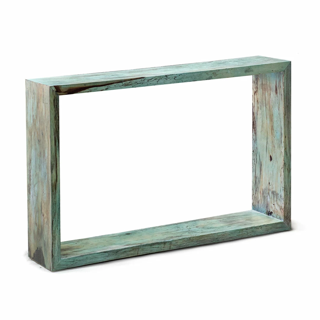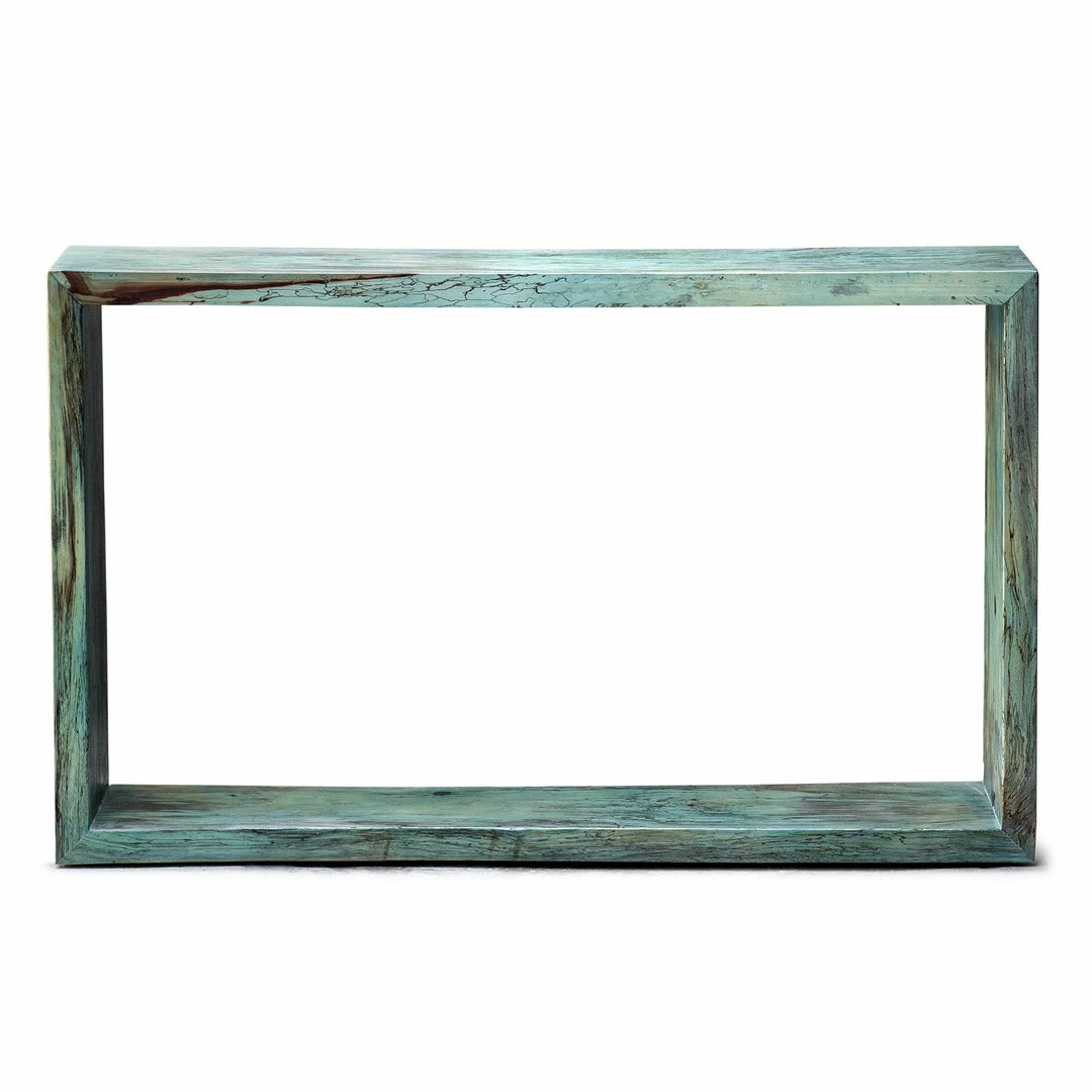 This fun statement console table features naturally spalted tamarind wood, finished in a soft Caribbean blue-green.