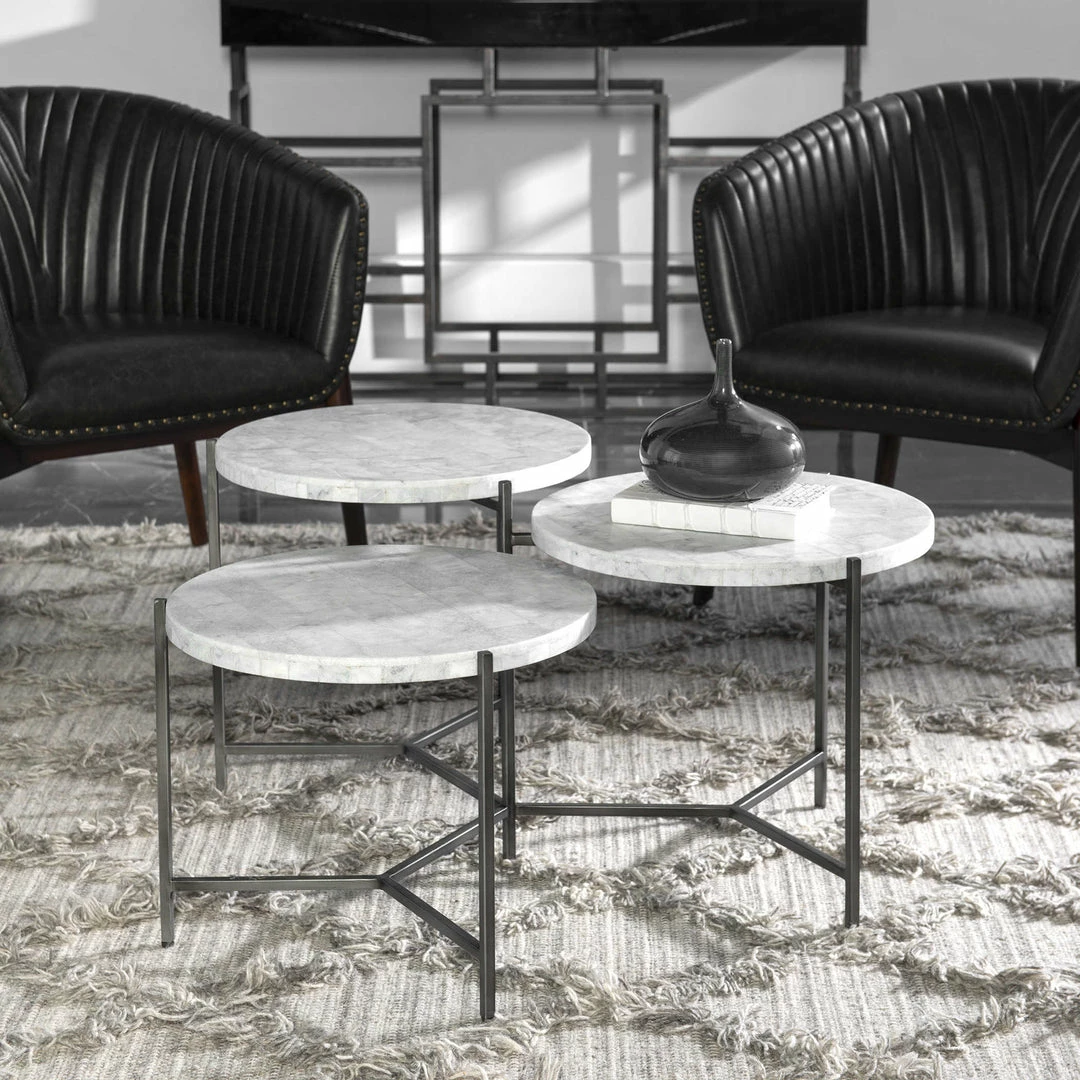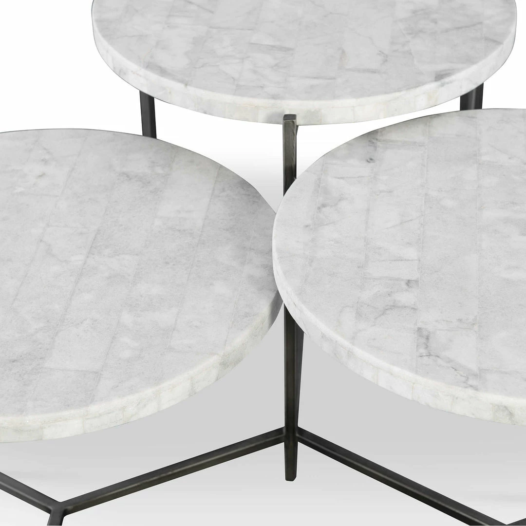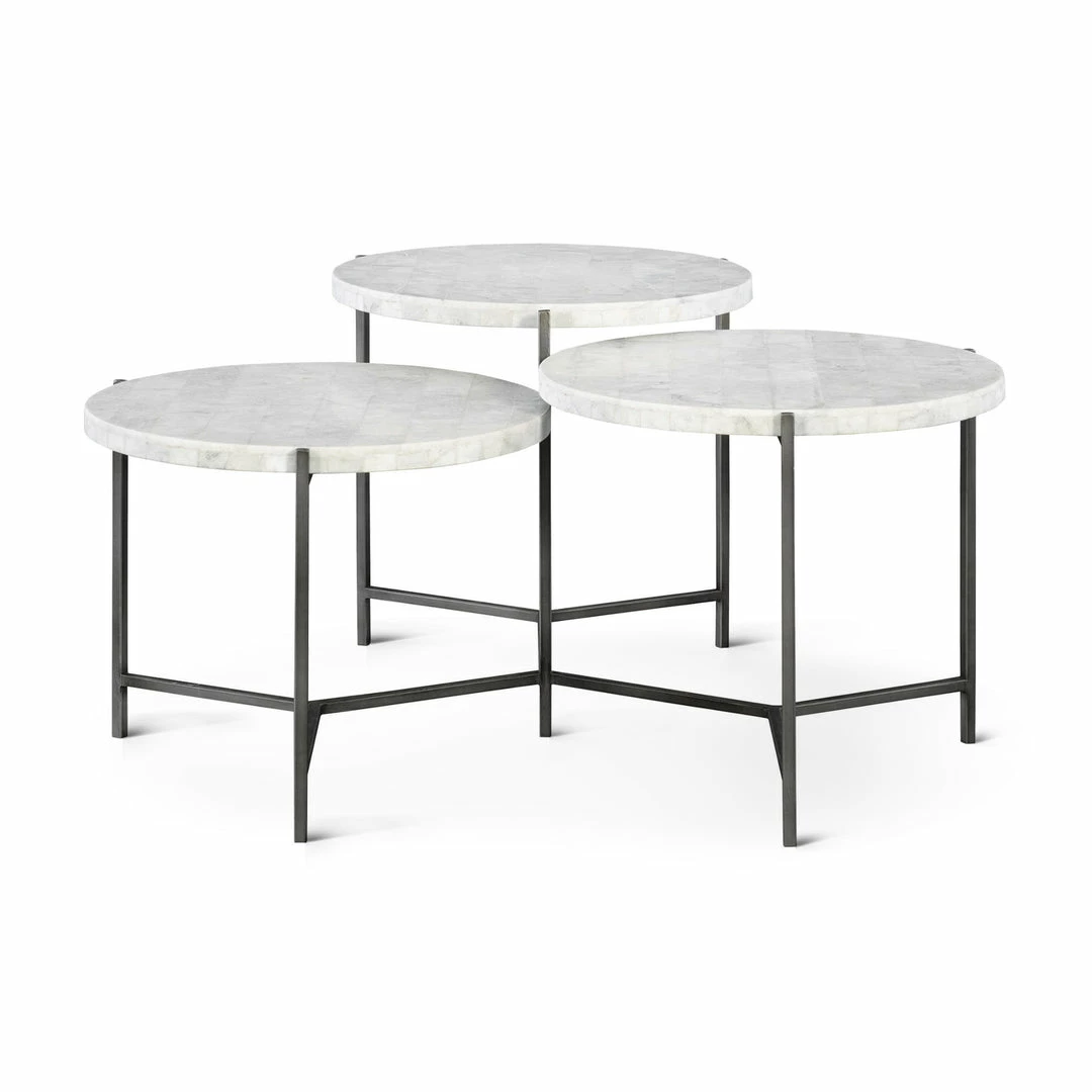 Clean contemporary styling is featured in this tiered coffee table design with white marble tops, on a forged iron base in a gunmetal finish.