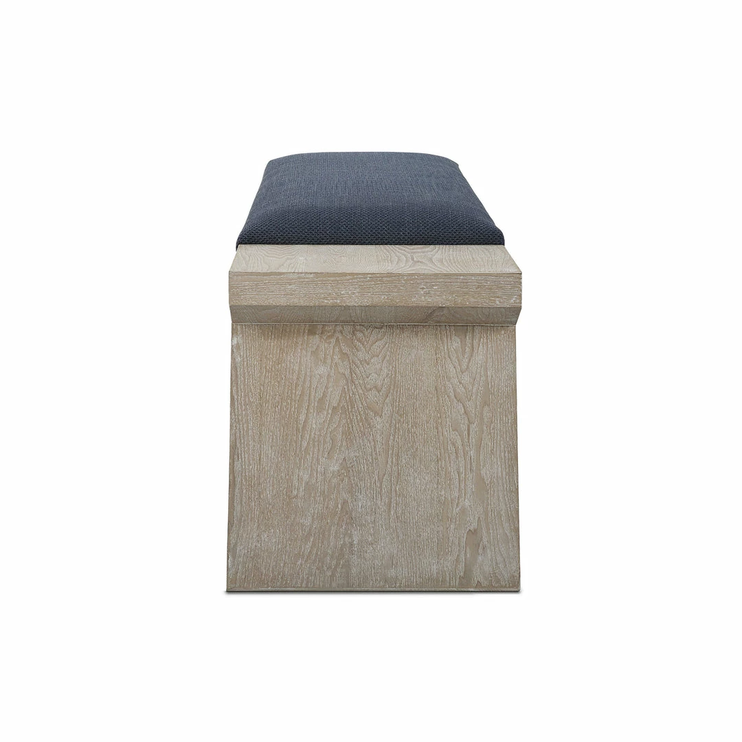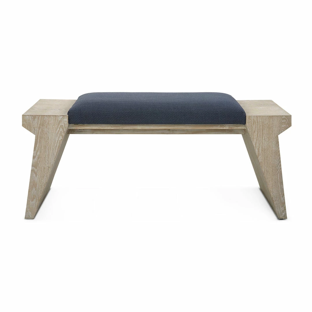 The Davenport bench adds a modern coastal touch with its asymmetrical legs in cerused fir wood exposing the natural wood grain, upholstered in a rich navy blue cotton blend fabric.