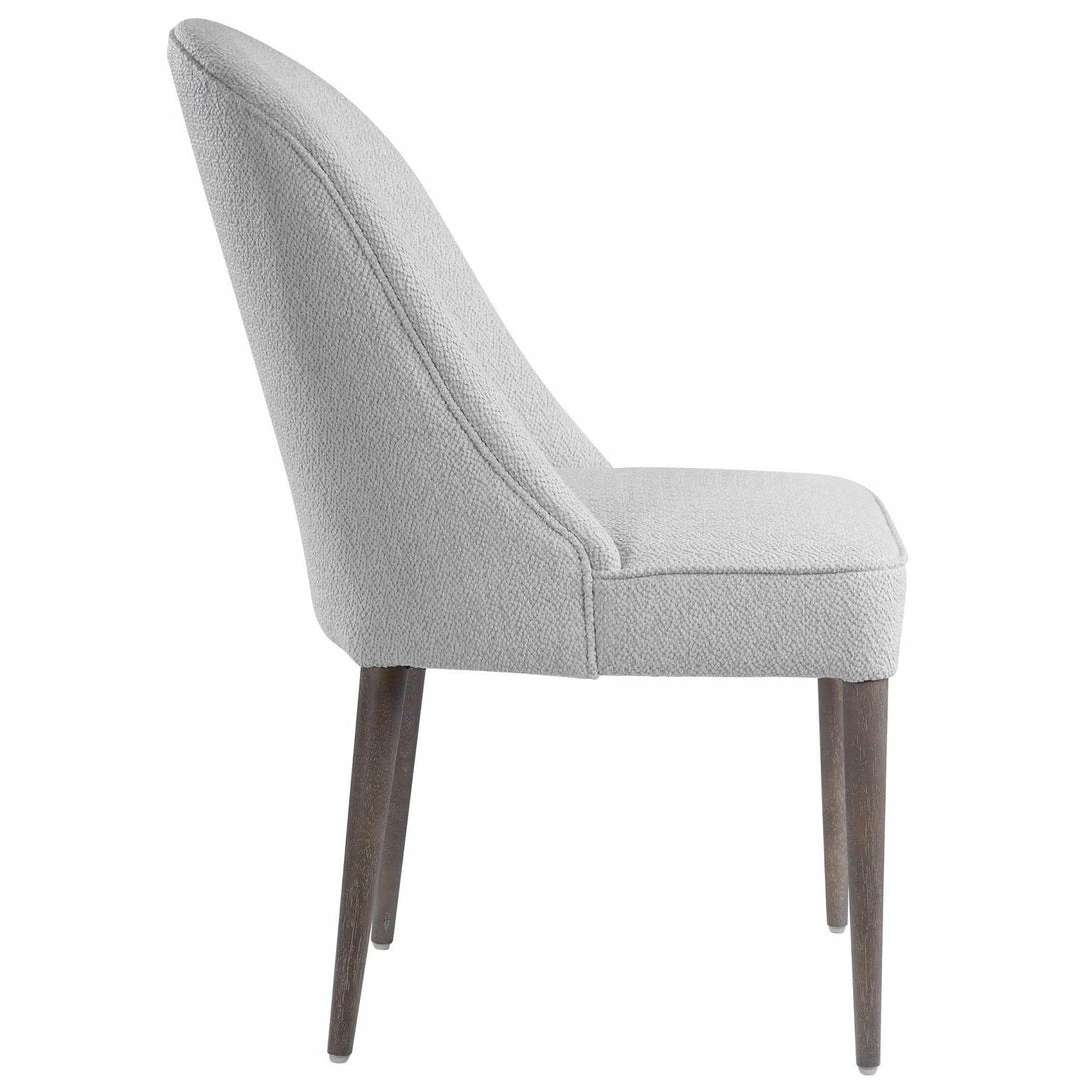 Perfect for modern dining, this armless dining chair features a casual off-white textured polypropylene fabric. As a fiber, polypropylene is strong, fade-resistant, and inherently stain resistant. Finished with welted trim and solid wood legs in light walnut.