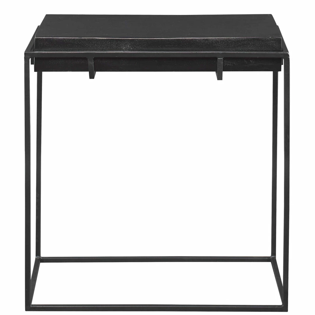 With modern minimalist styling, this side table features a thick cast aluminum top with natural texturing finished in a dark oxidized black, resting in a coordinating aged black iron base.