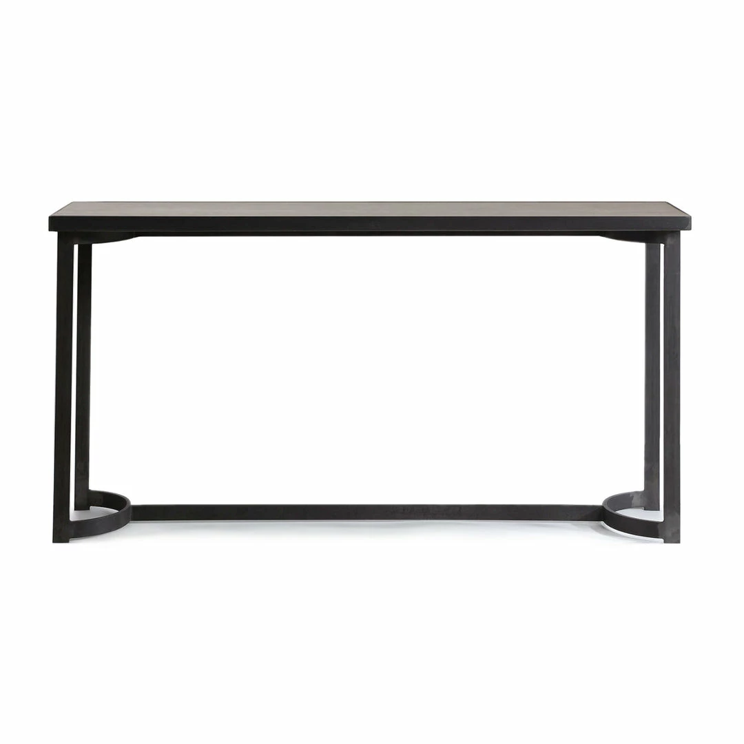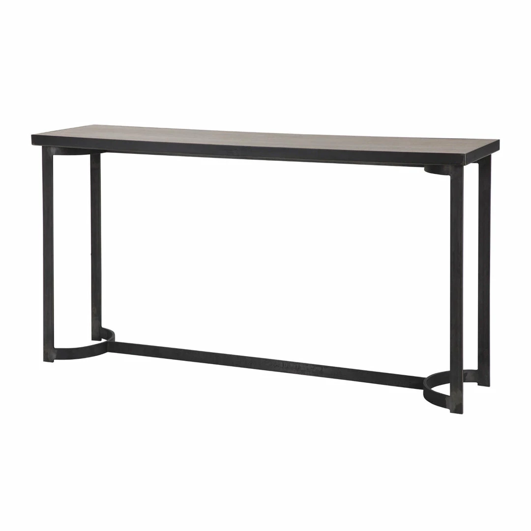 Evoking modern industrial lodge style, this clean lined console showcases a natural oak veneer top finished in a light gray, paired with a curved hand forged iron base in aged steel with natural burnishing.