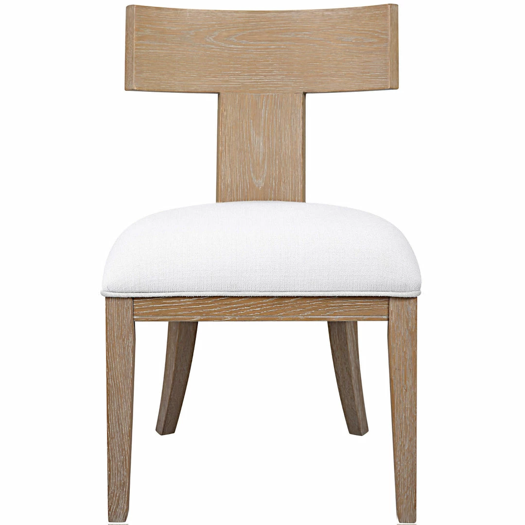 A casual take on a classic design, this klismos style chair features an oak wood frame with a natural oak finish, paired with a white slubbed performance fabric cushion.