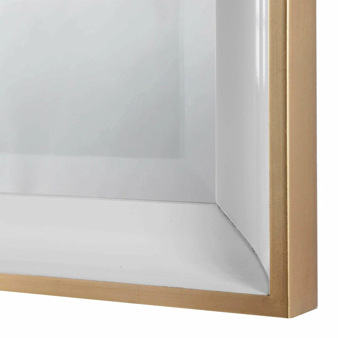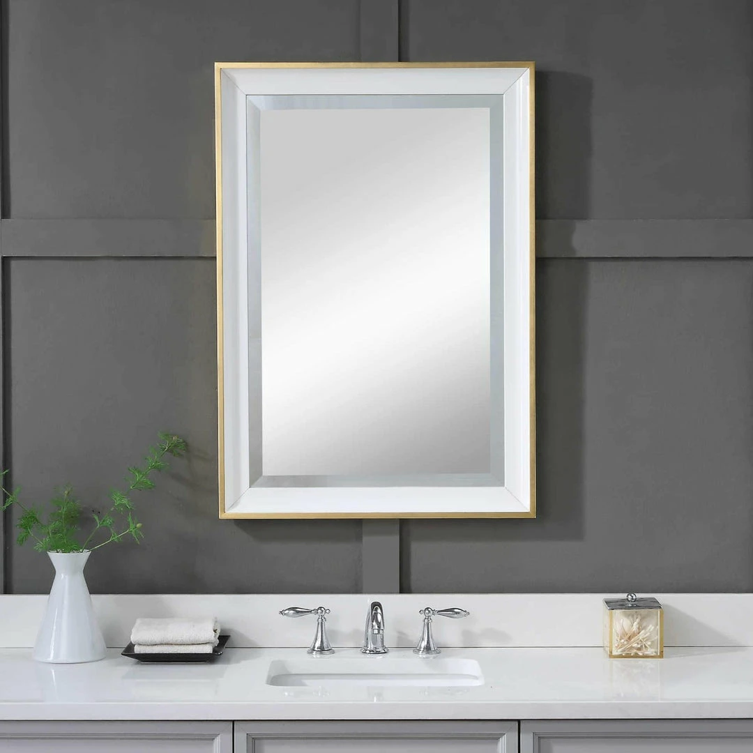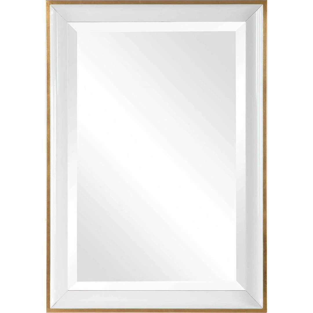 This elegantly refined design has a large gloss white inner frame accented by a petite gold leaf outer frame. The mirror has a 1″ bevel.