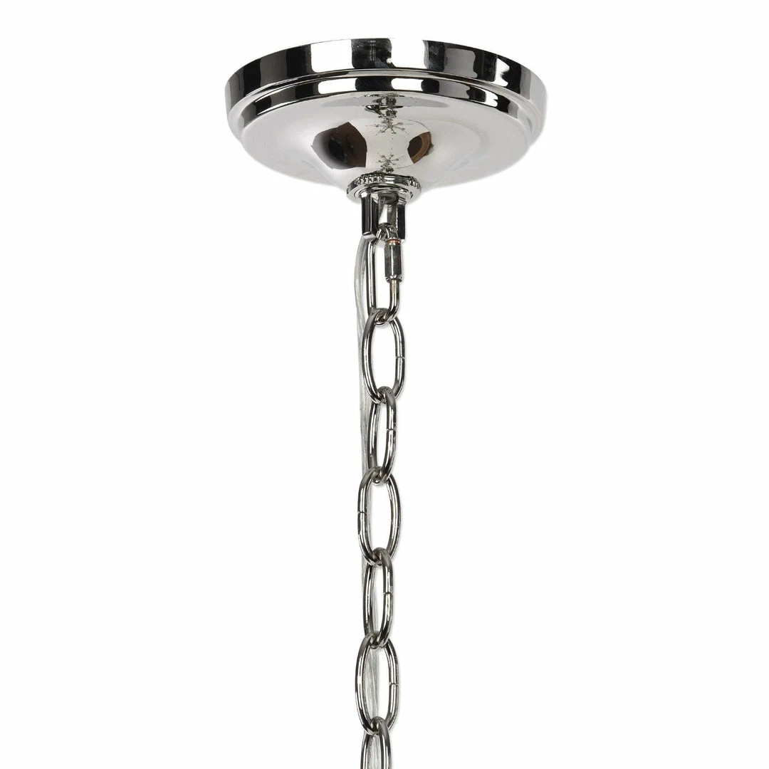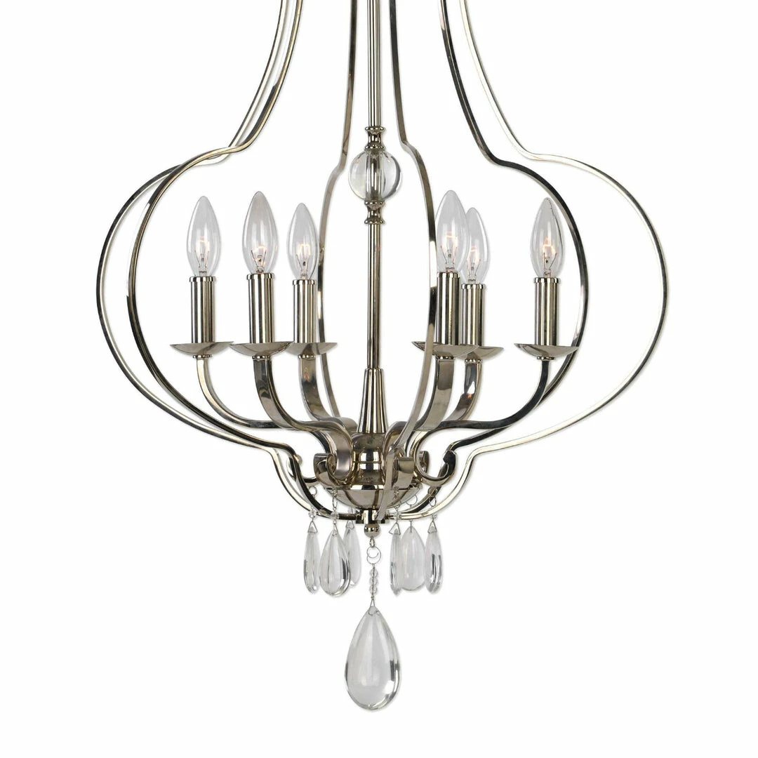 Graceful 6 Lt. polished nickel square arm chandelier with the petite arms floating on the outside of the center candle cluster in a unique genie bottle shape enhanced with clear glass drop accents at both the top and bottom of the chandelier.
