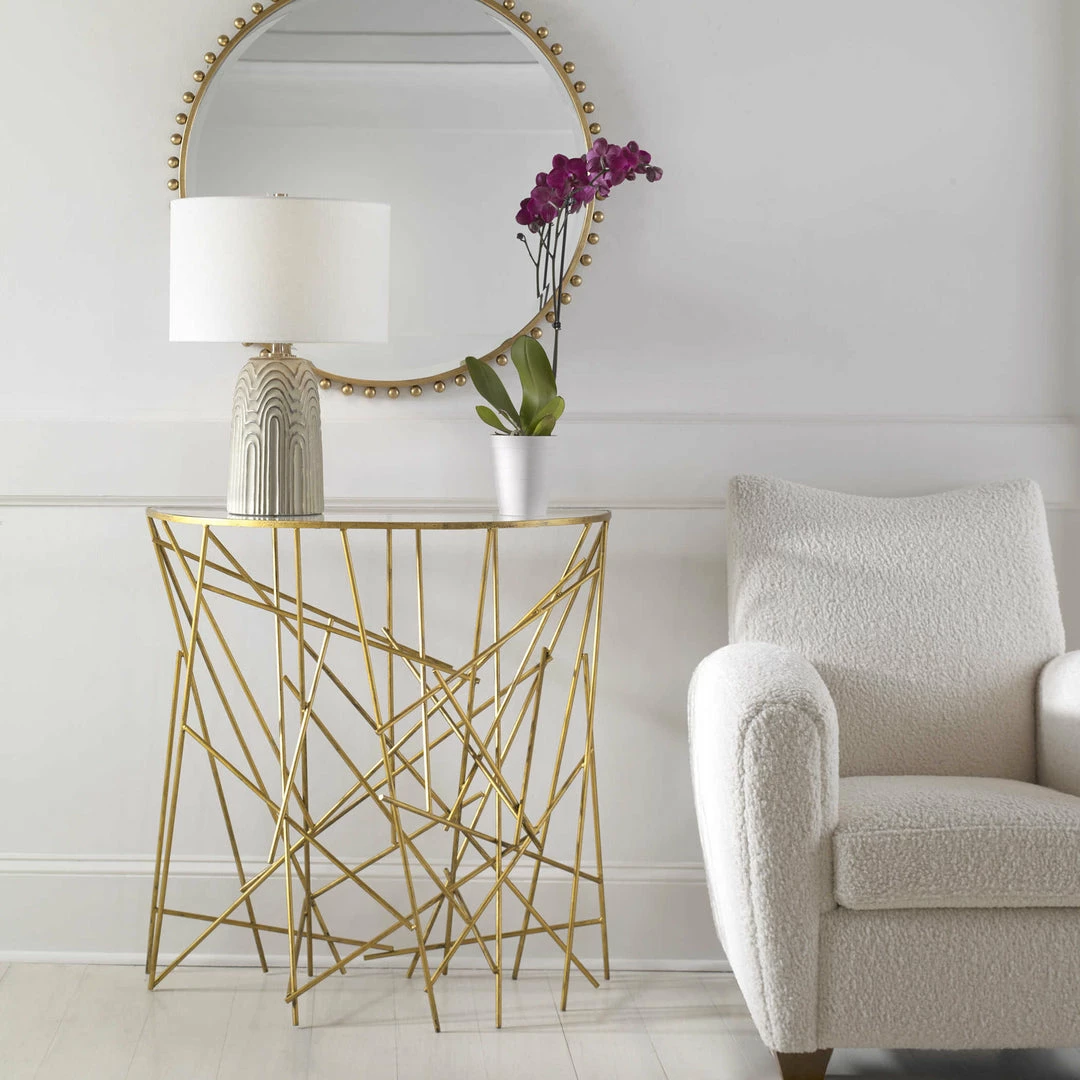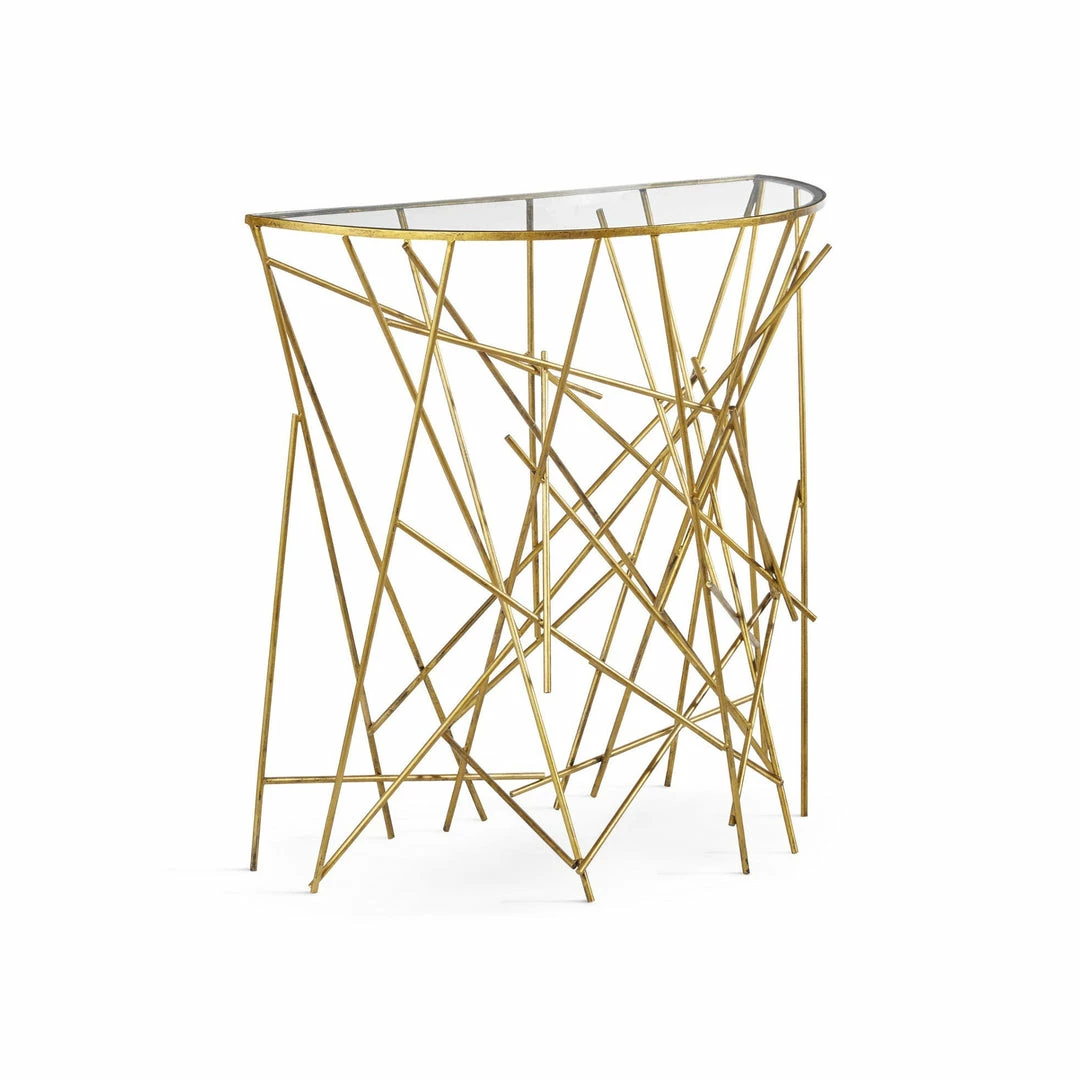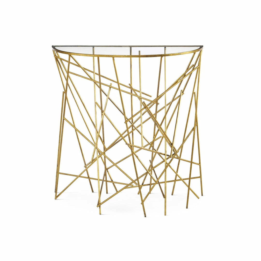 Modern with a classic feel, this demilune console is perfect for a smaller space or entryway. The abstract sculptural base is constructed from iron rods that are individually finished in a timeless antique gold with a clear tempered glass top.
