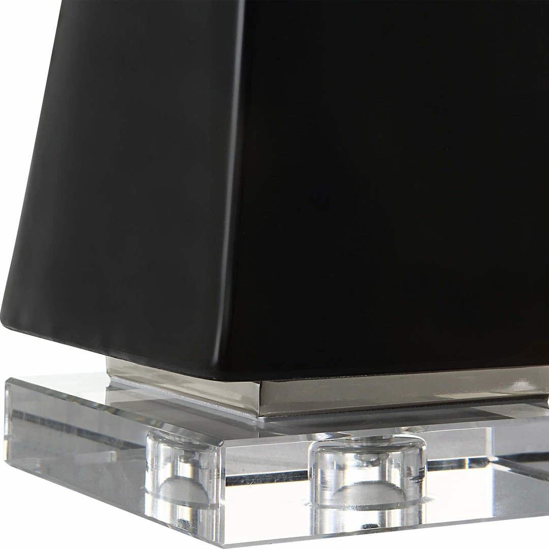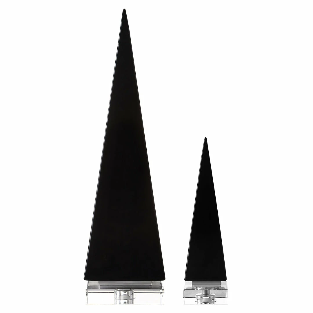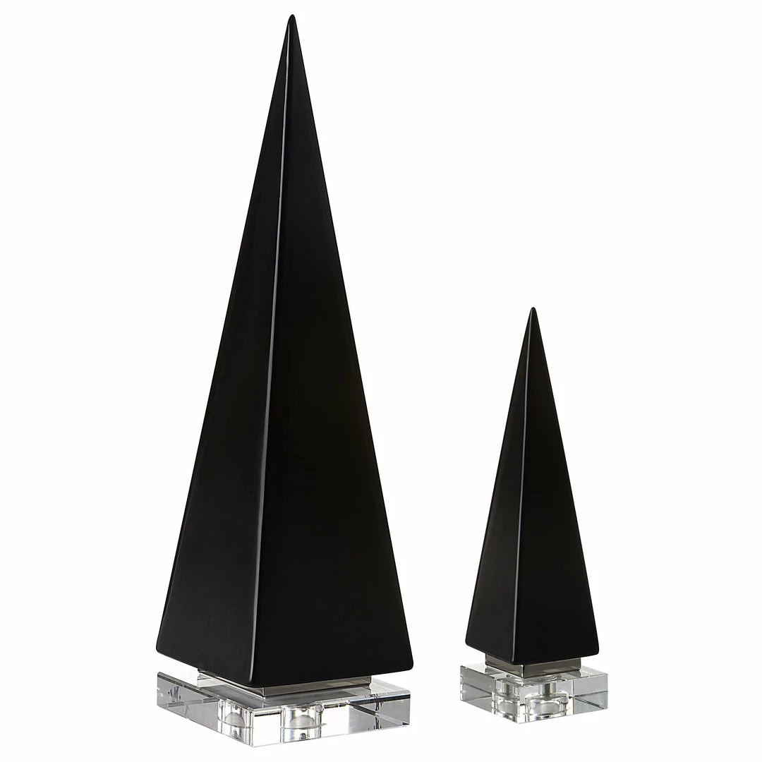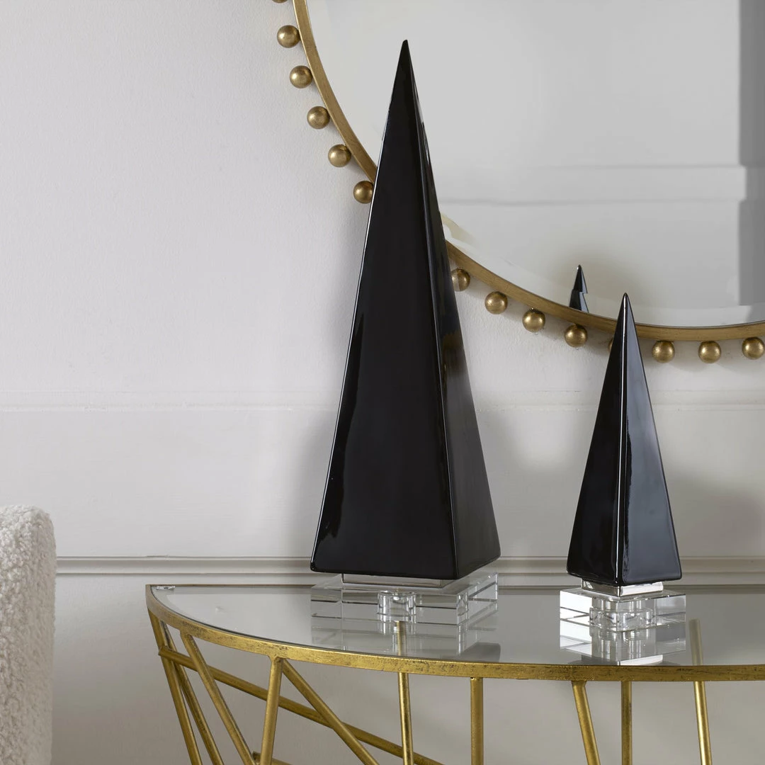 Set of two ceramic pyramid sculptures are finished in a glossย black glaze, accented by polished nickel plated bands and elegant crystal feet.