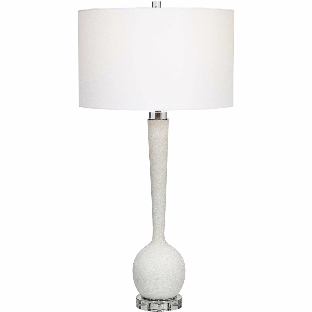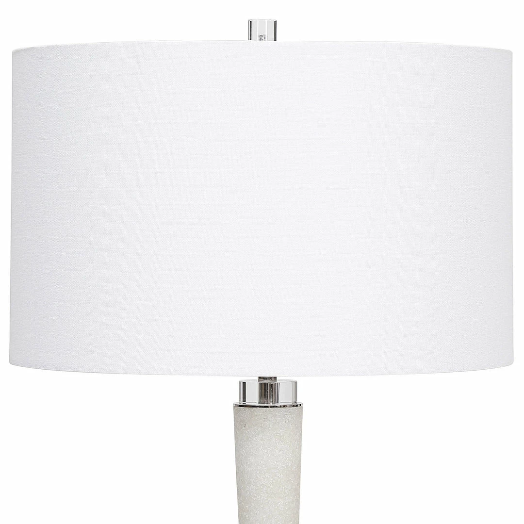 This elegant table lamp is executed in a rich looking material made of granulated white marble that accurately replicates the look of Thassos marble, accented by thick crystal details. A white hardback drum shade completes the lamp.