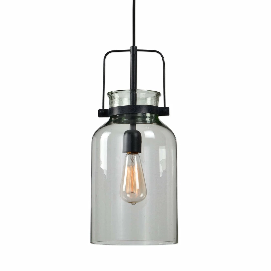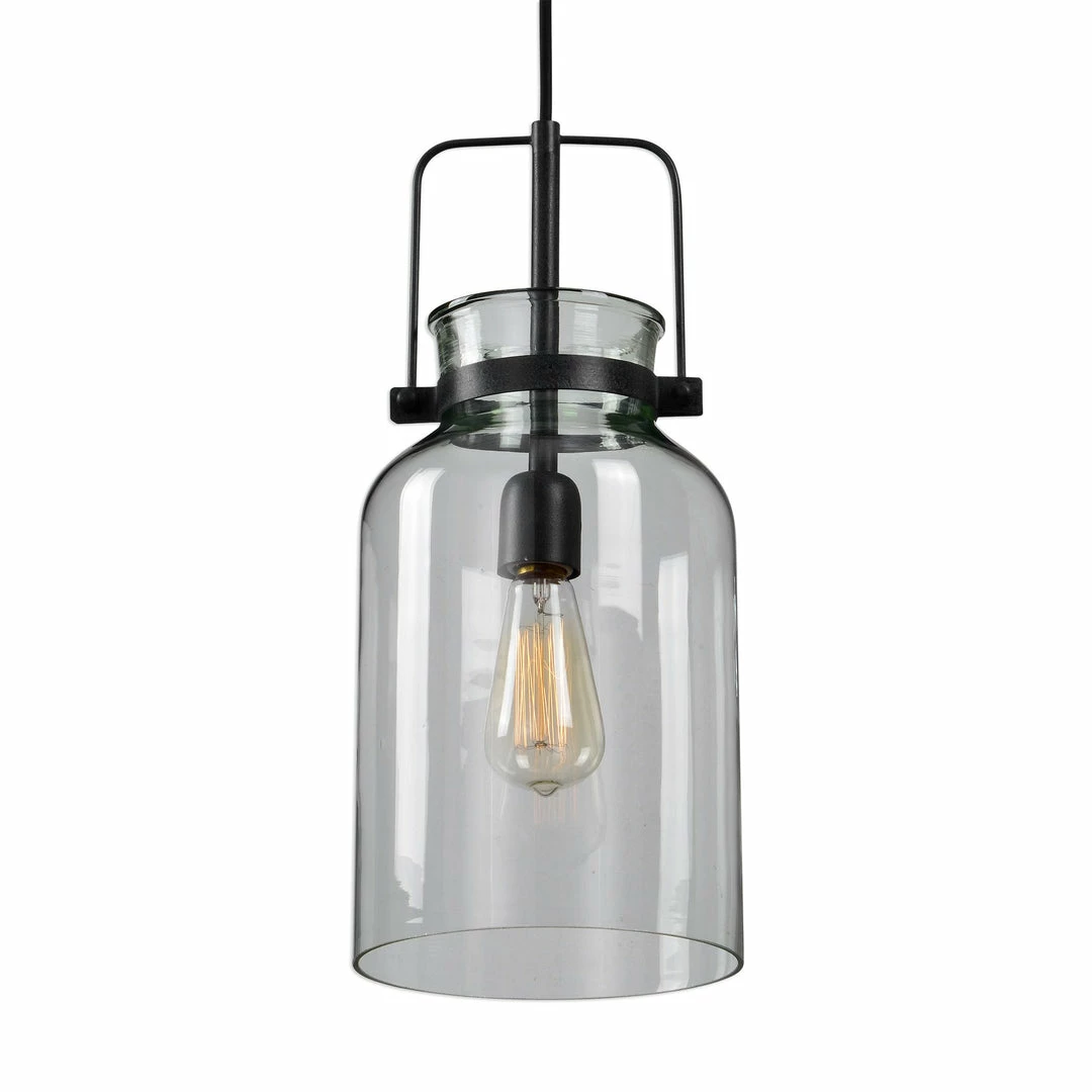 Soft industrial simplicity and farmhouse charm give this mini pendant a clean look. Featuring clear glass in a Milk bottle shape with a textured black finish. 1-100 watt max Edison socket and ships with 1-60 watt antique style decorative ST64 bulb. Includes 15′ cord for adjustable installation.