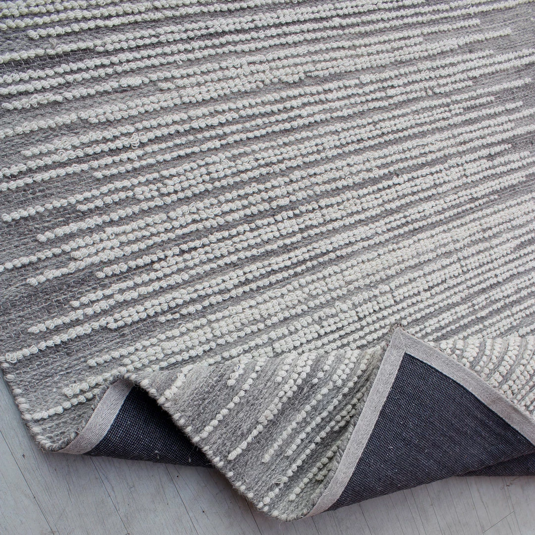 This hand woven rug features natural undyed gray wool with looped ivory raised details.