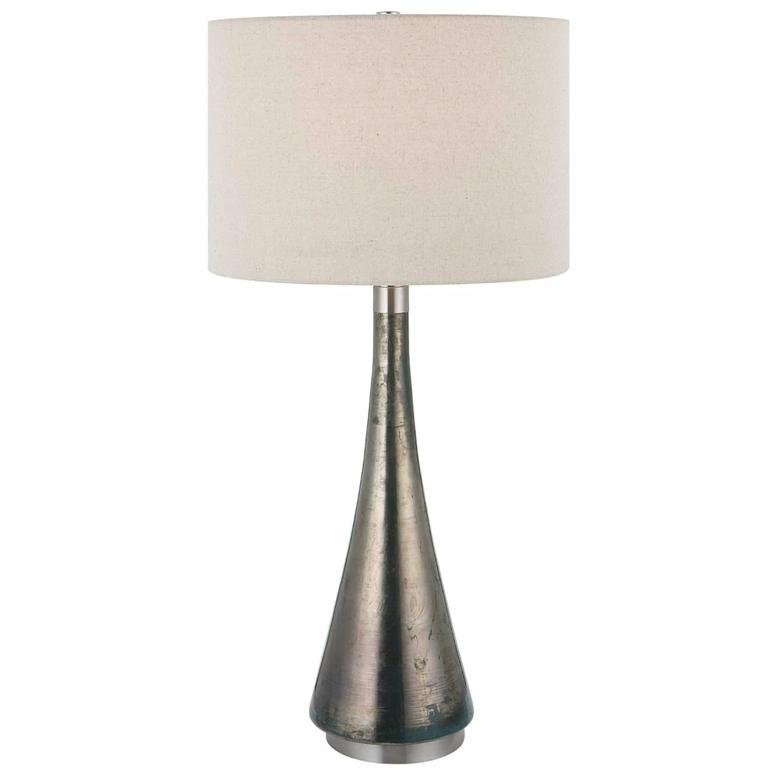 This table lamp features a graceful tapered base crafted from artisanal blue-green metallic glass. Iron accents are finished in brushed nickel. The drum shade is covered in a light oatmeal fabric with natural slubbing.