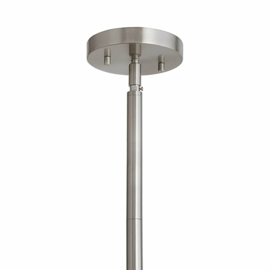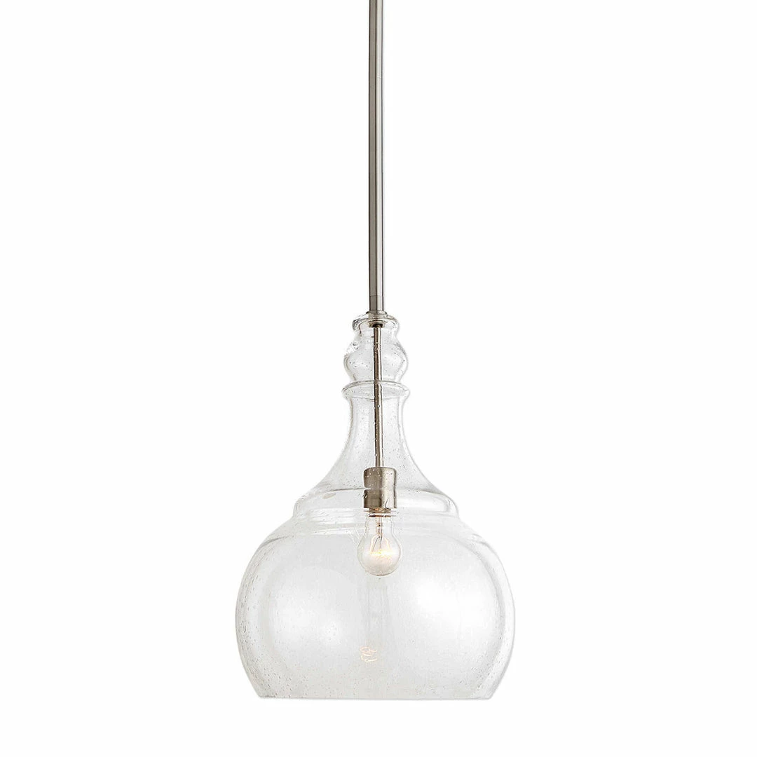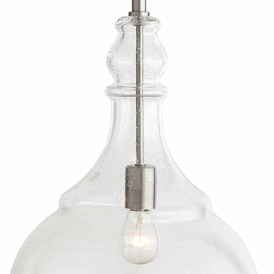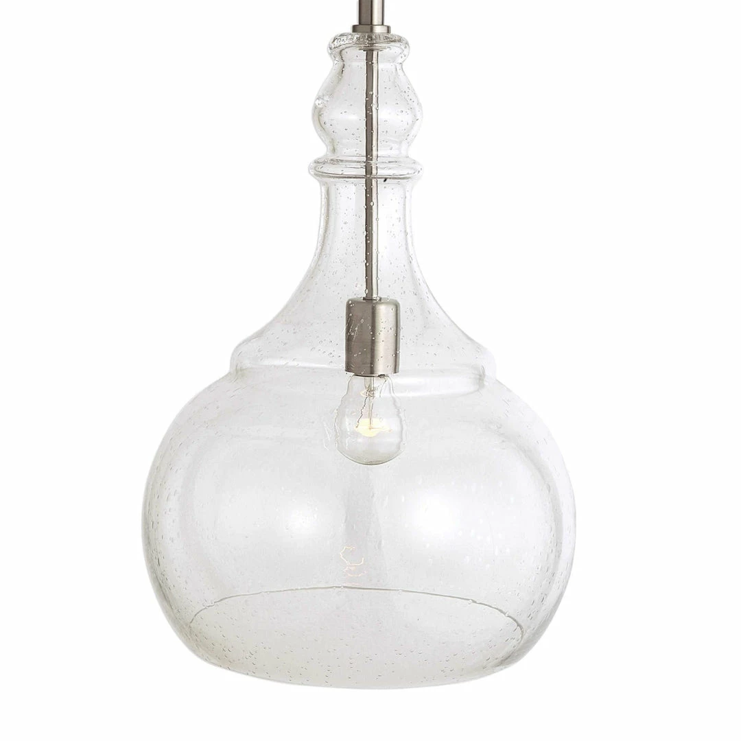 Clear seeded glass teardrop pendant with brushed nickel metal hardware steps easily into many of today’s interior styles.