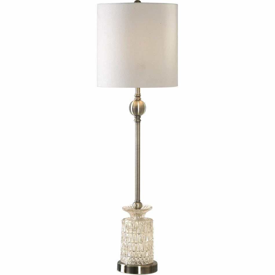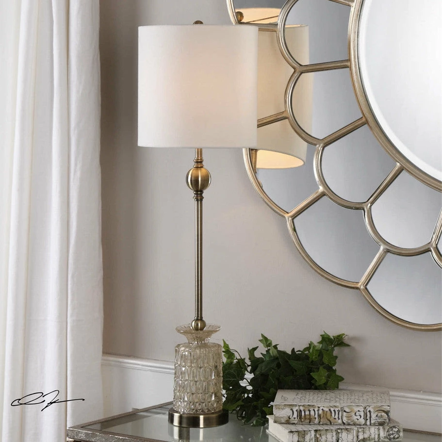 Light champagne glass, showcasing elegant features, accented with antique brass plated details. The round hardback drum shade is a white linen fabric with natural slubbing.
