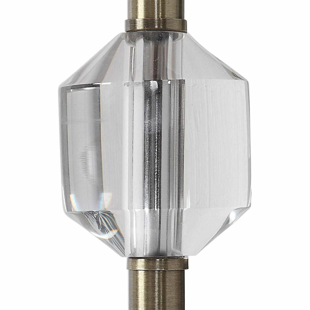 This elegant piece showcases a slender profile featuring polished cut crystal details, paired with plated antique brass accents.