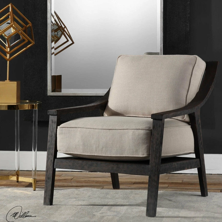 A casual combination with a modern take, this open back accent chair features a dramatically curved rustic hardwood frame with exposed grain under a rich walnut finish. Welt trimmed comfortable box cushions are a neutral beige linen blended fabric.