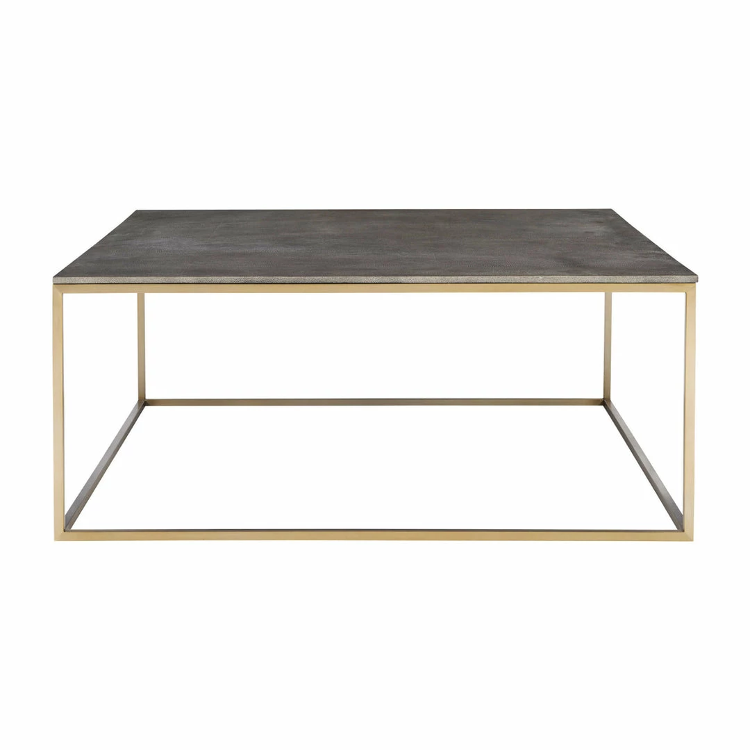 Inspired by modern styling, this coffee table features a beveled faux shagreen wrapped top in charcoal gray paired with a sleek stainless steel base finished in brushed brass.