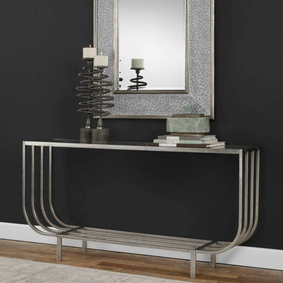 This clean lined, over-sized console table features hand forged iron in a bright silver leaf finish, with three panels of clear tempered glass.