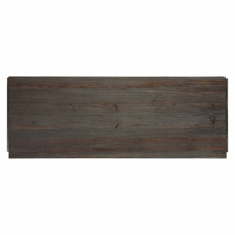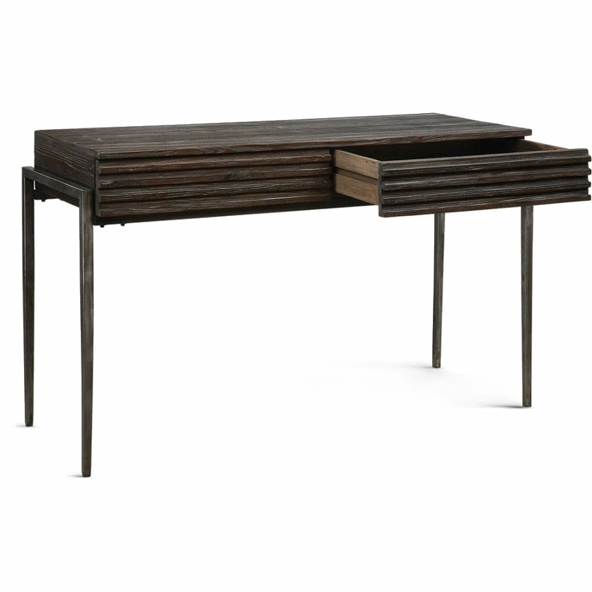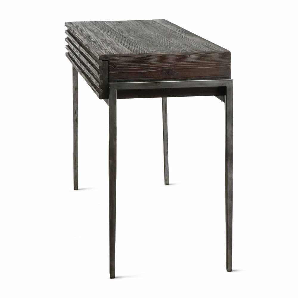 A fusion of rustic and industrial elements, this console features a grooved front with two storage drawers. Handcrafted from reclaimed pine and finished in a walnut stain with deep gray glaze resting in the grain, set in an old iron frame with tapered legs.