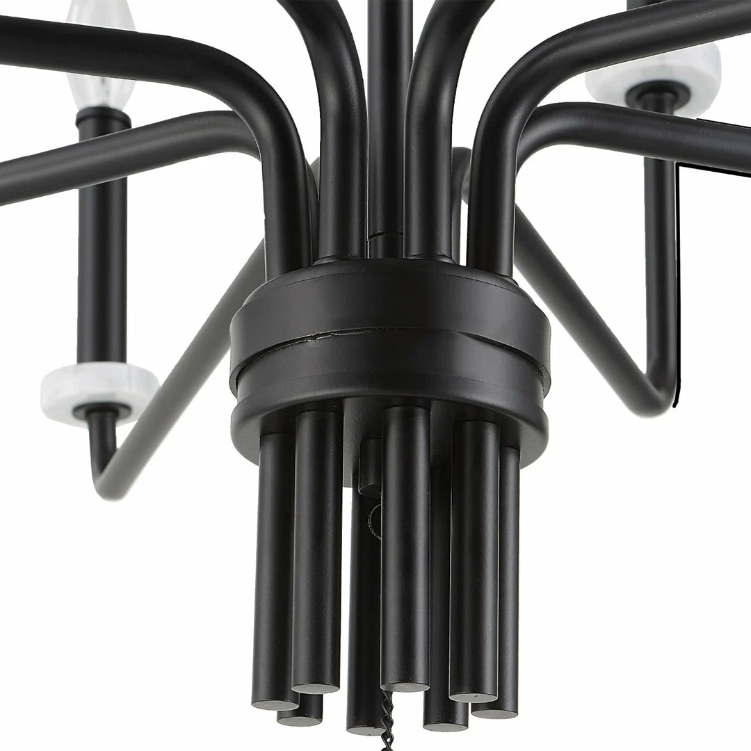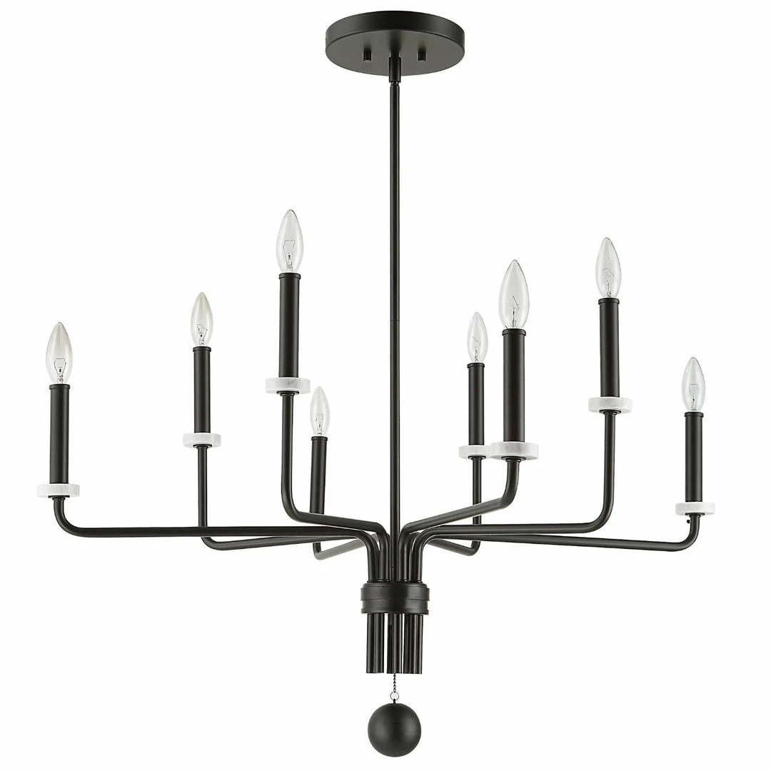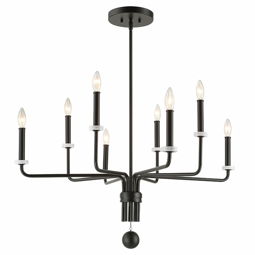 Modern and sleek softly bent lines give this 8 Lt. chandelier a dramatic feel, finished in a deep matte black with chic white marble disc bobeches.