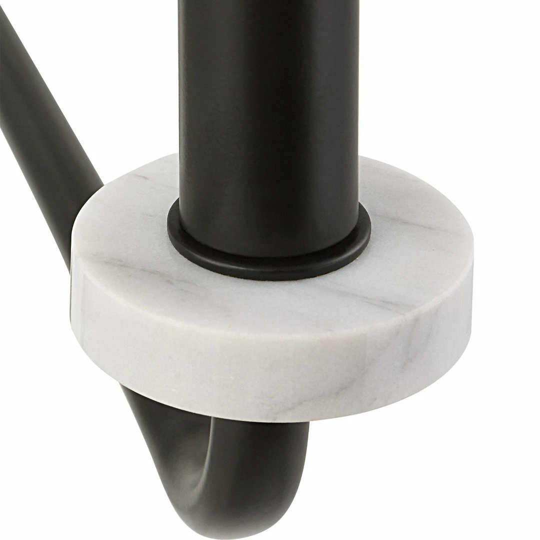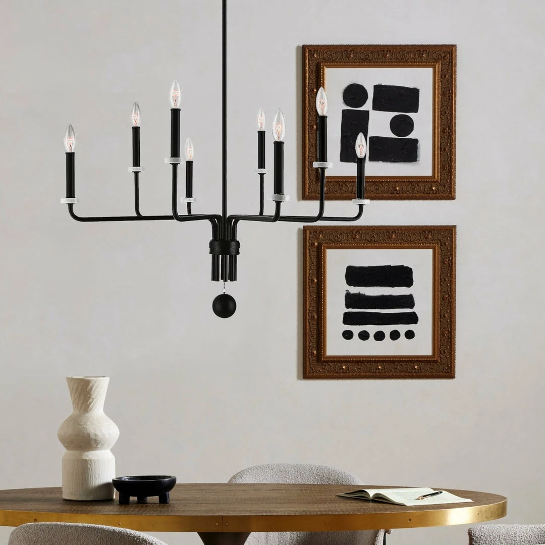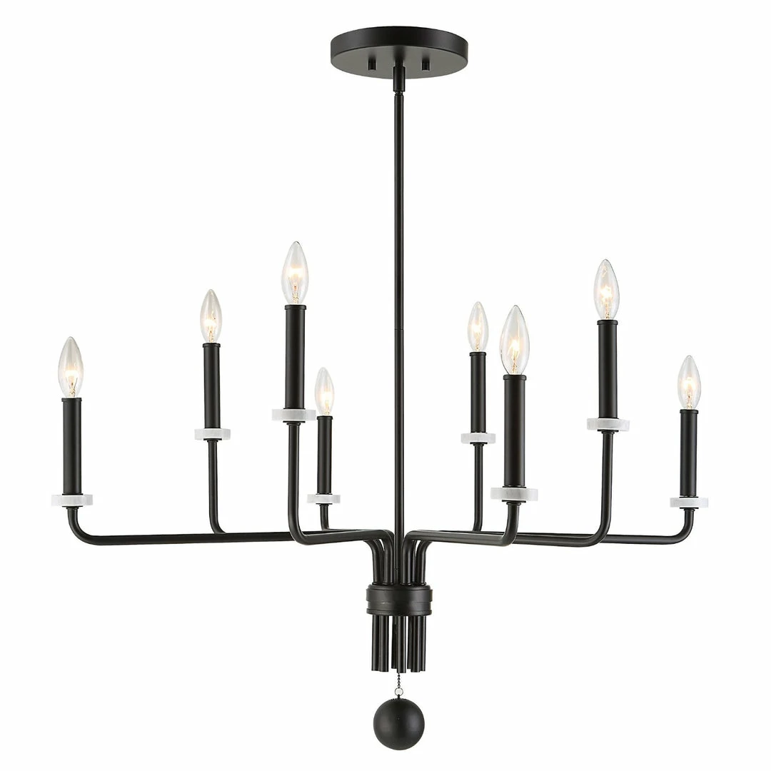 Modern and sleek softly bent lines give this 8 Lt. chandelier a dramatic feel, finished in a deep matte black with chic white marble disc bobeches.