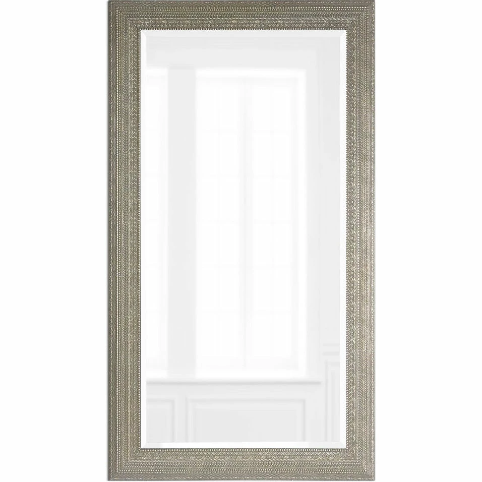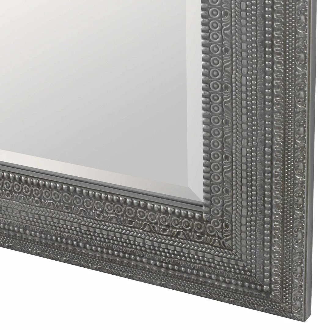 Frame features an antiqued silver-champagne finish with a light gray wash. Mirror is beveled.