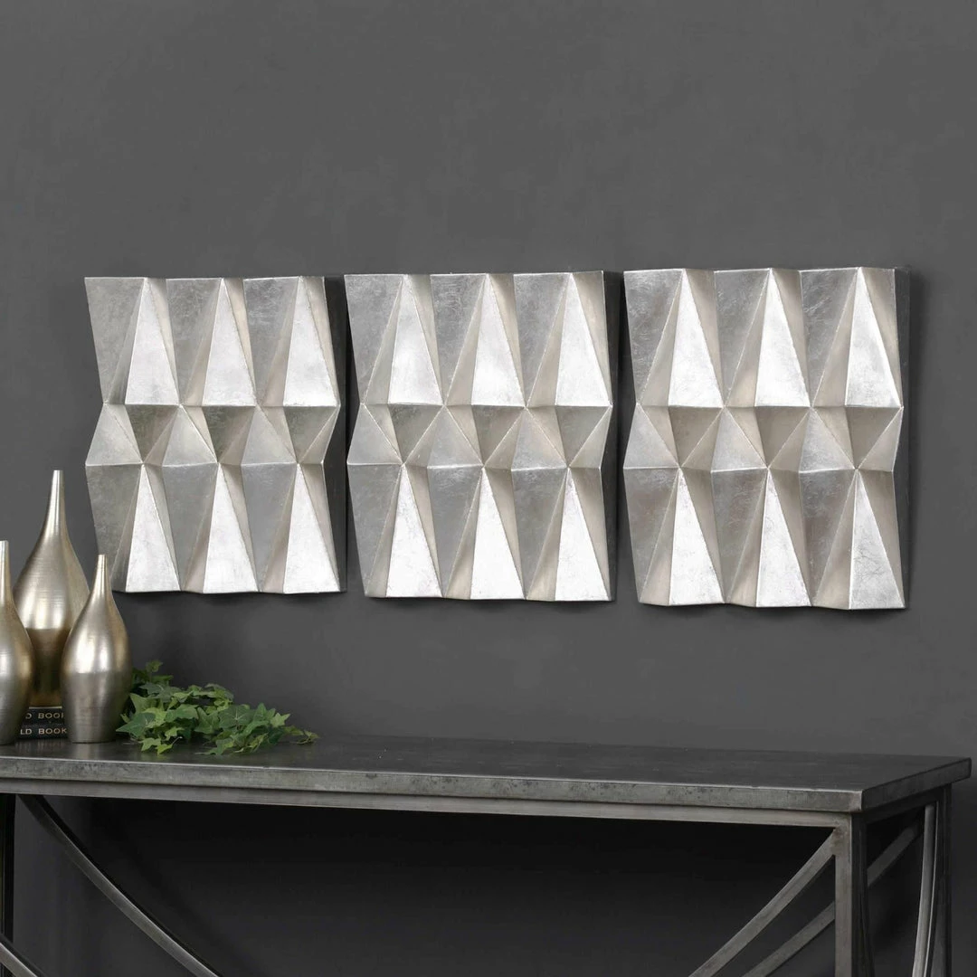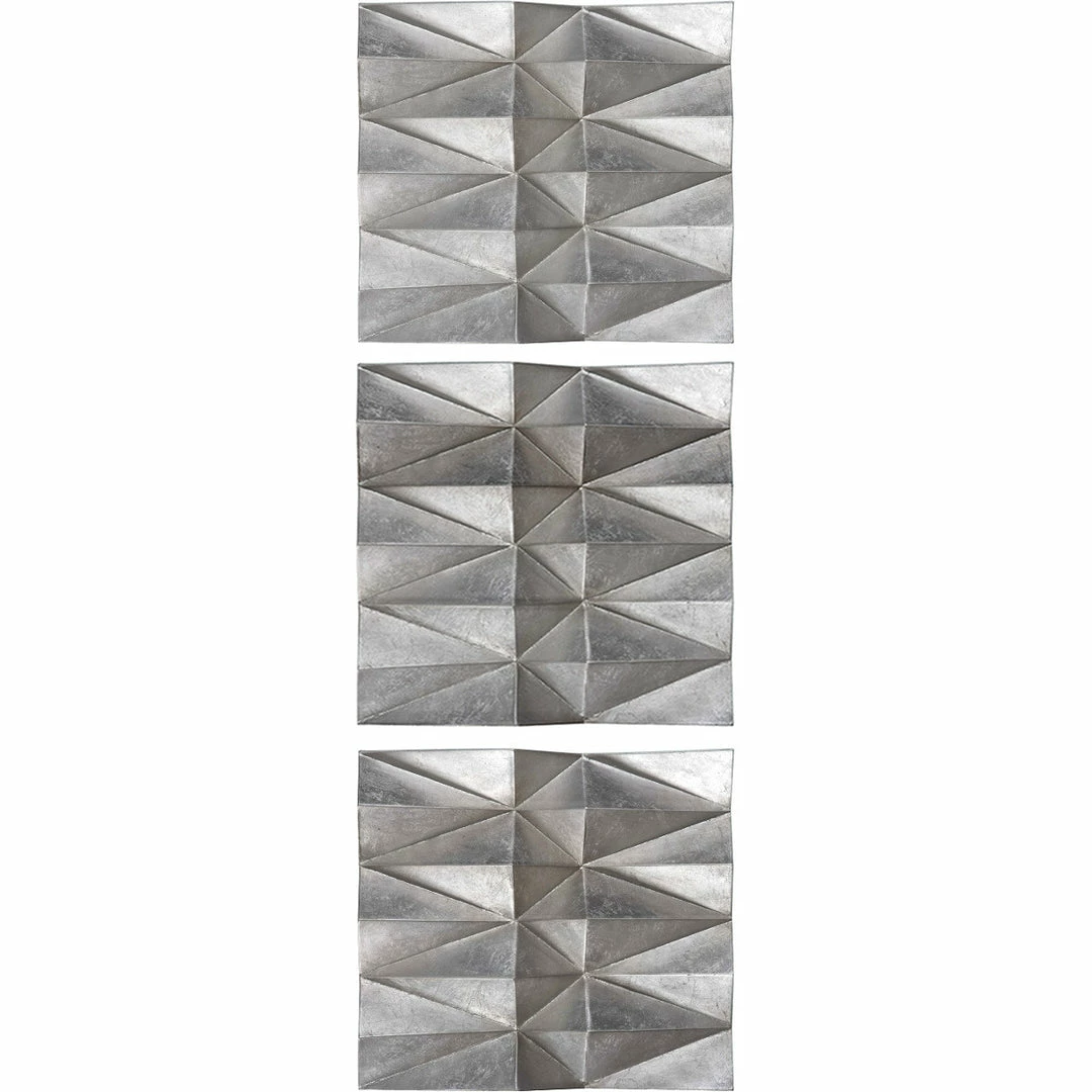 Multi-faceted, three dimensional iron panels finished in champagne silver leaf. May be hung horizontal or vertical.