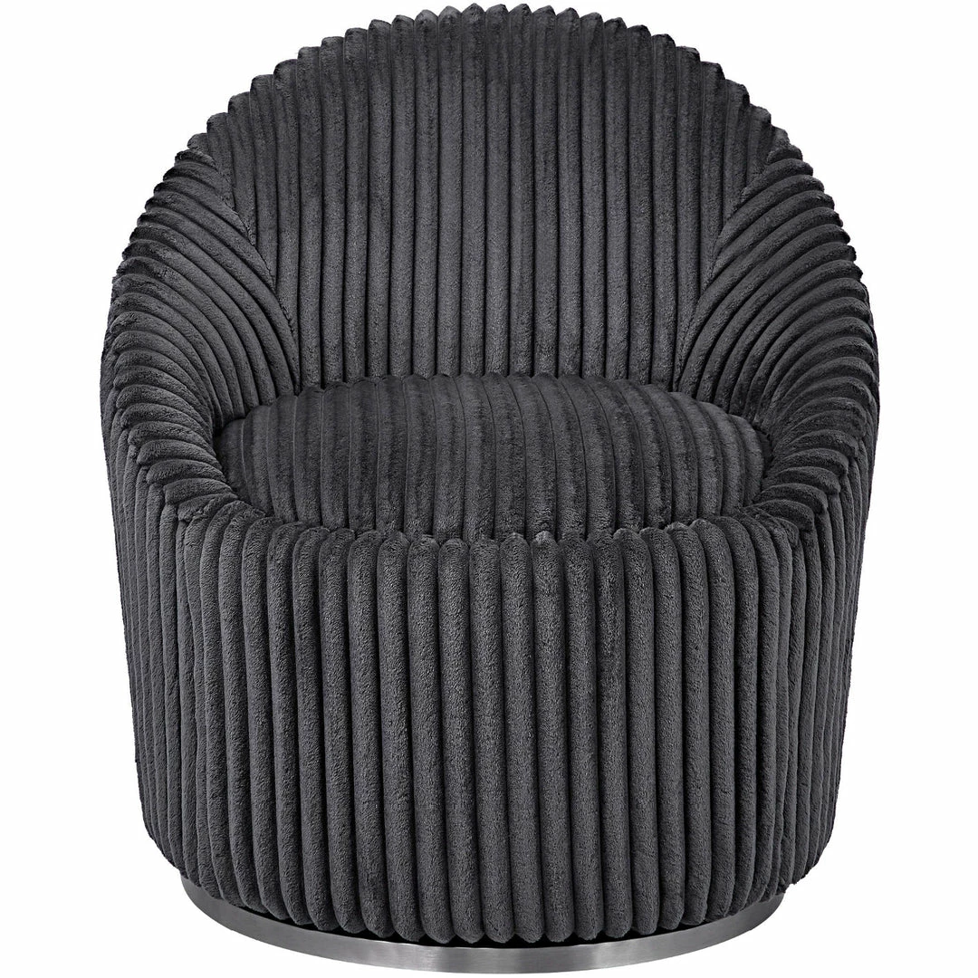 This refined swivel chair envelopes you in luxury and comfort with plush fluted gunmetal grey sherpa chenille fleece upholstery, a beautifully contoured back, and ample foam and fiber padding. The brushed nickel stainless steel swivel base contrasts beautifully with the upholstery.