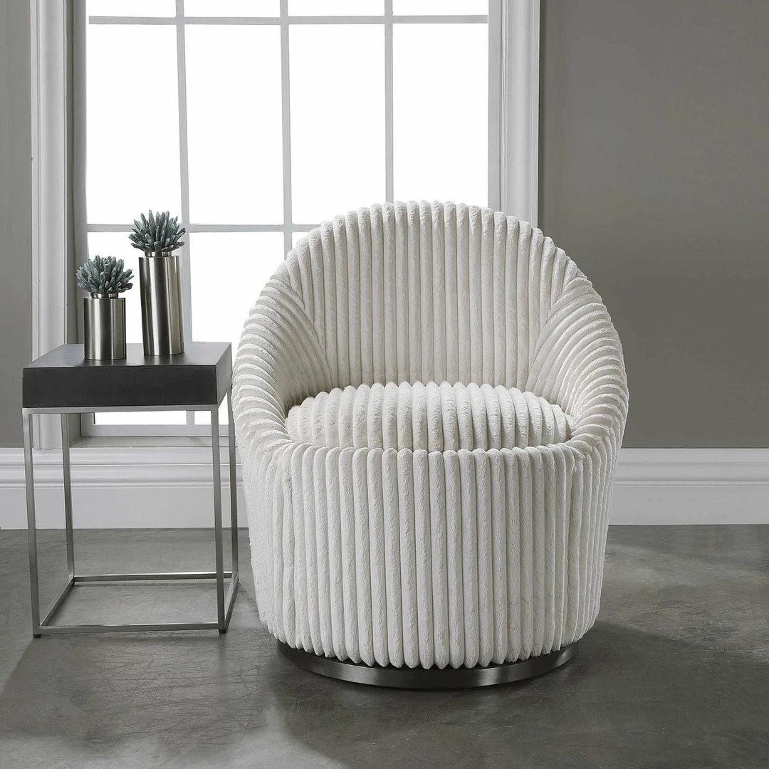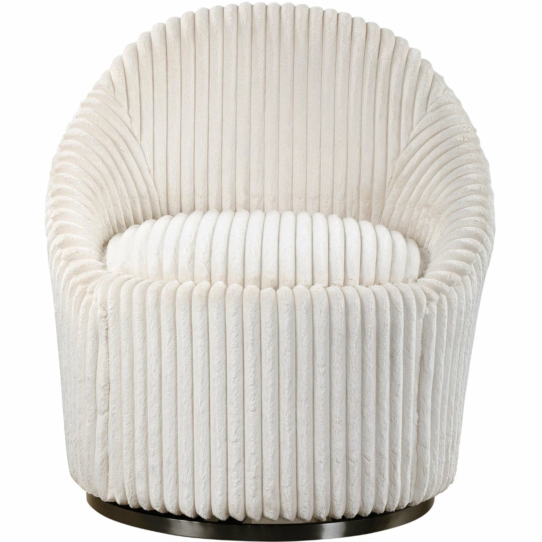 This refined swivel chair envelopes you in luxury and comfort with plush fluted ivory sherpa chenille fleece upholstery, a beautifully contoured back, and ample foam and fiber padding. The brushed black nickel stainless steel swivel base contrasts beautifully with the upholstery.
