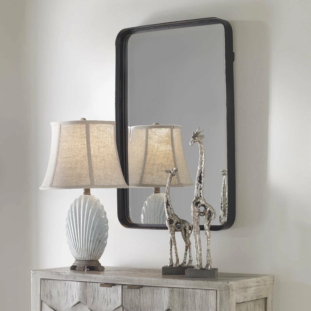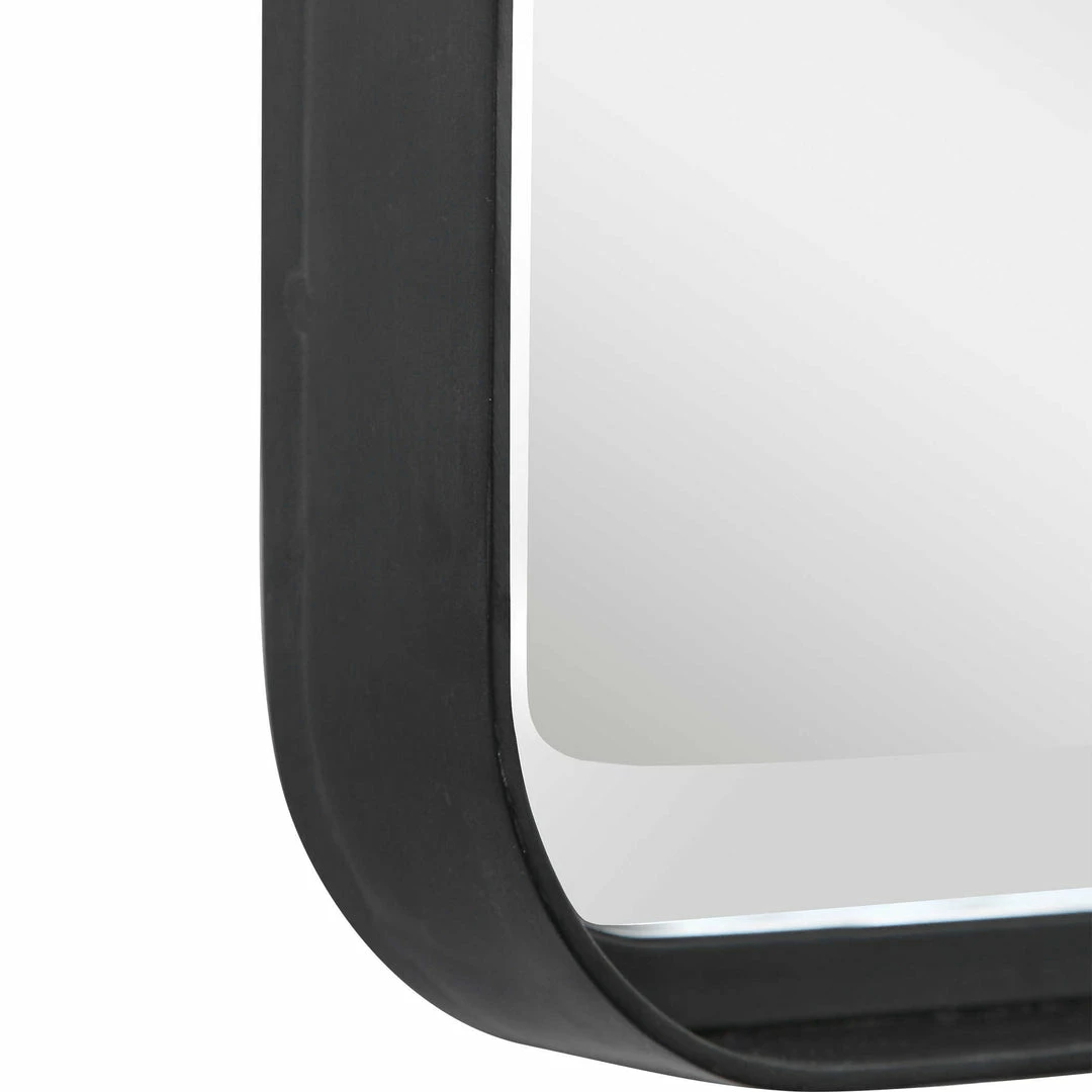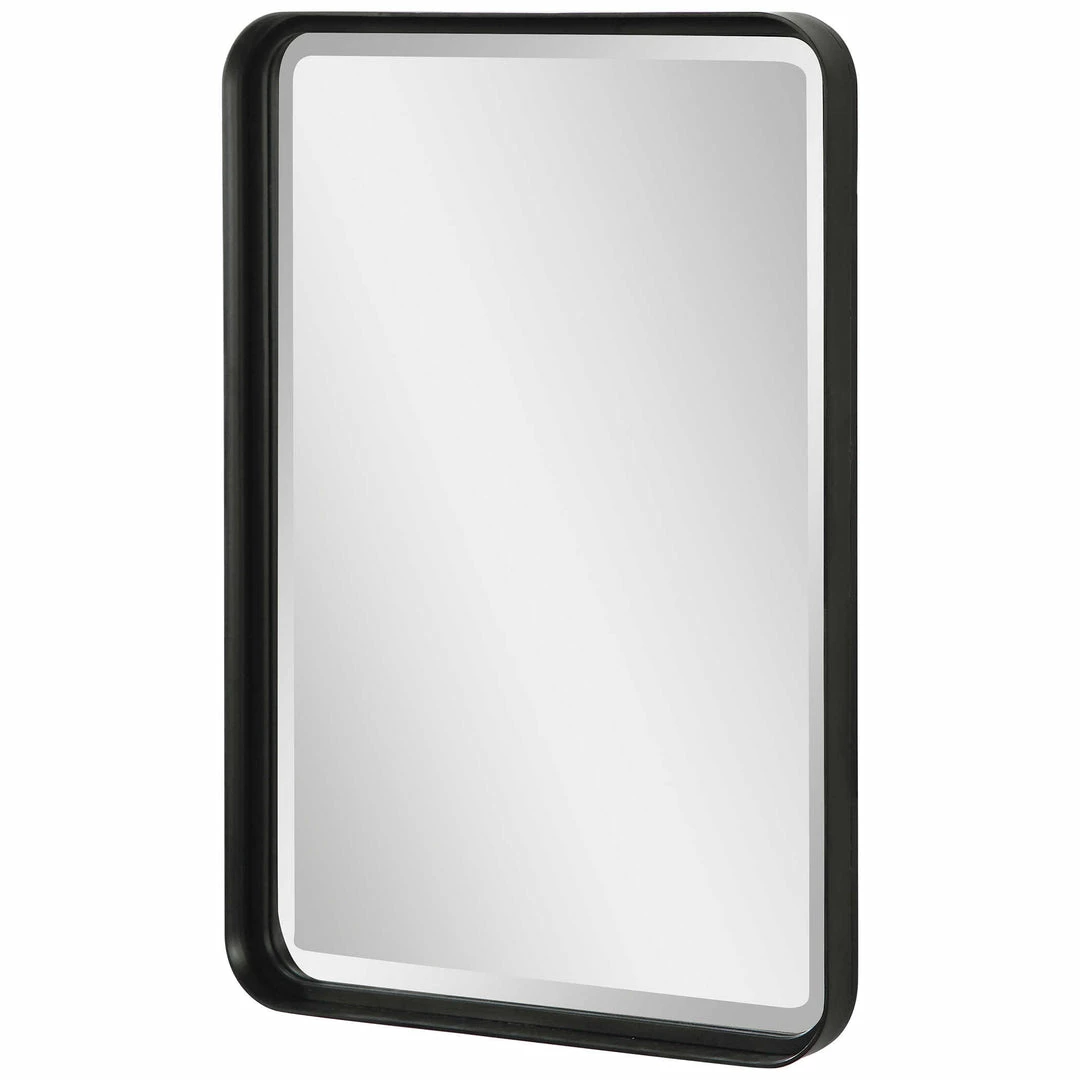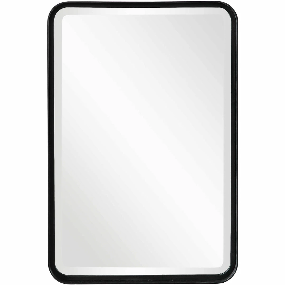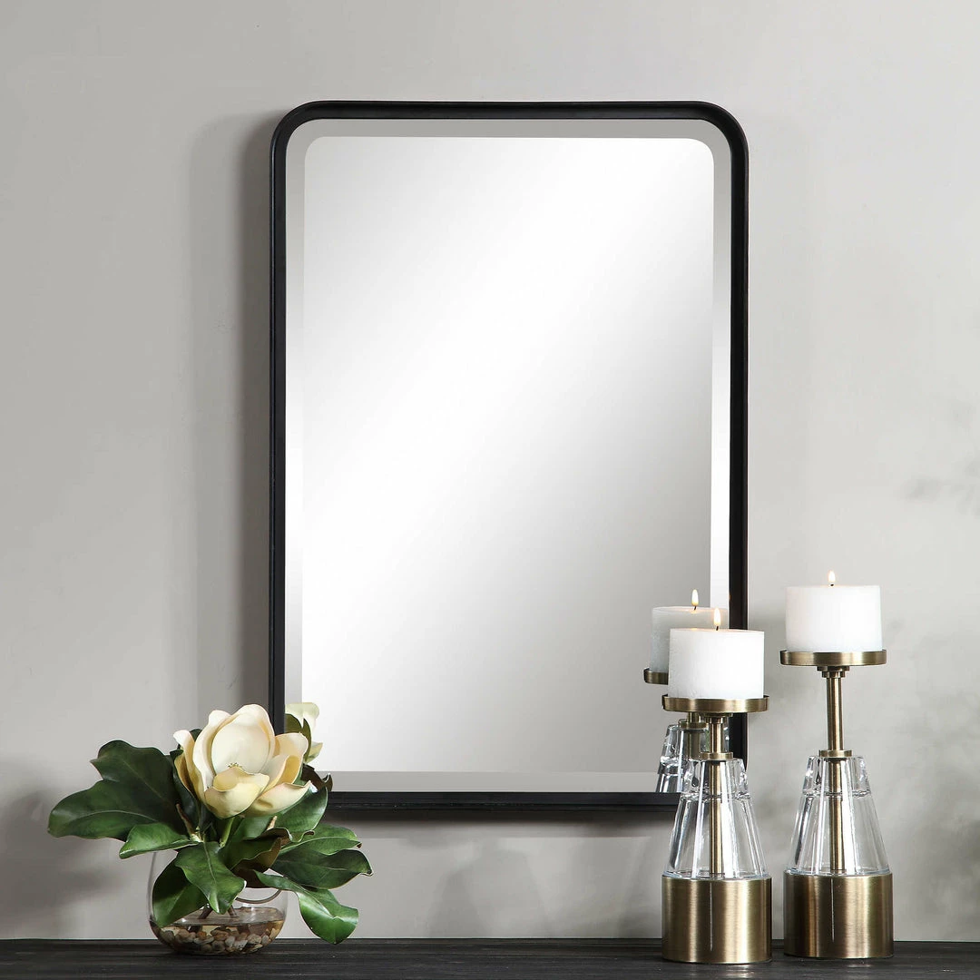 Versatile in design, this vanity mirror is constructed from a forged metal strap finished in matte black. The mirror has a 1 1/4″ bevel.
