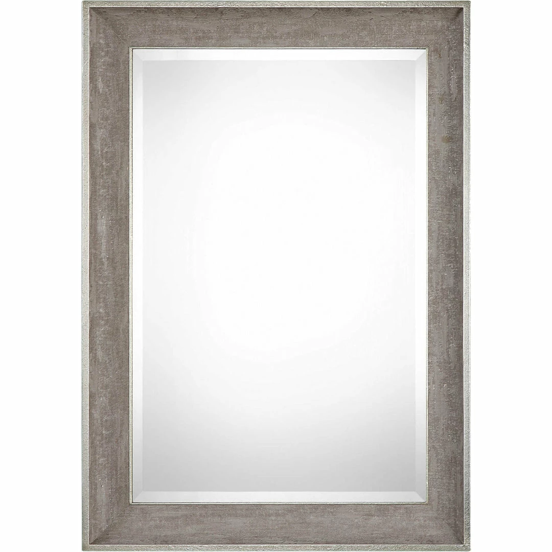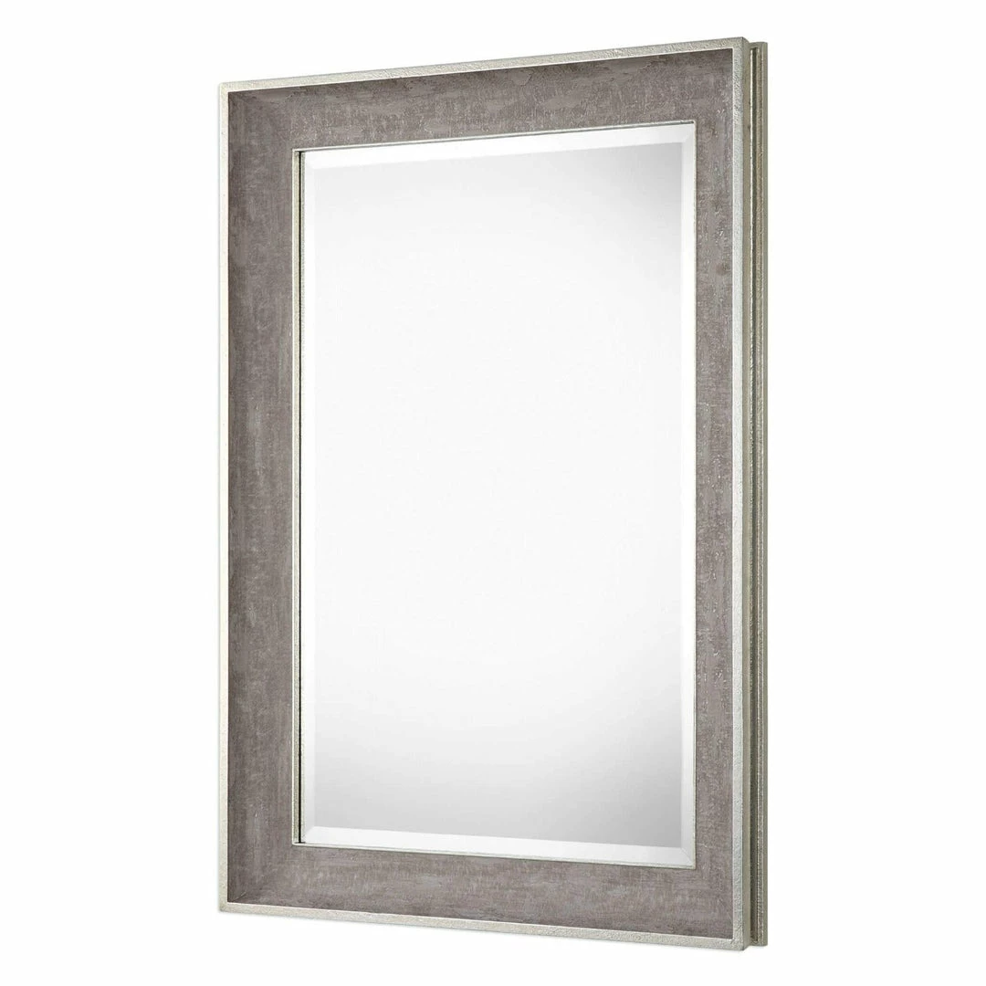 The solid pine frame of the Corrado features a sloped profile with a heavily textured warm gray wrapped finish for a rustic appearance. Accented with metallic silver inner and outer edges, this mirror features a generous 1 1/4″ bevel.