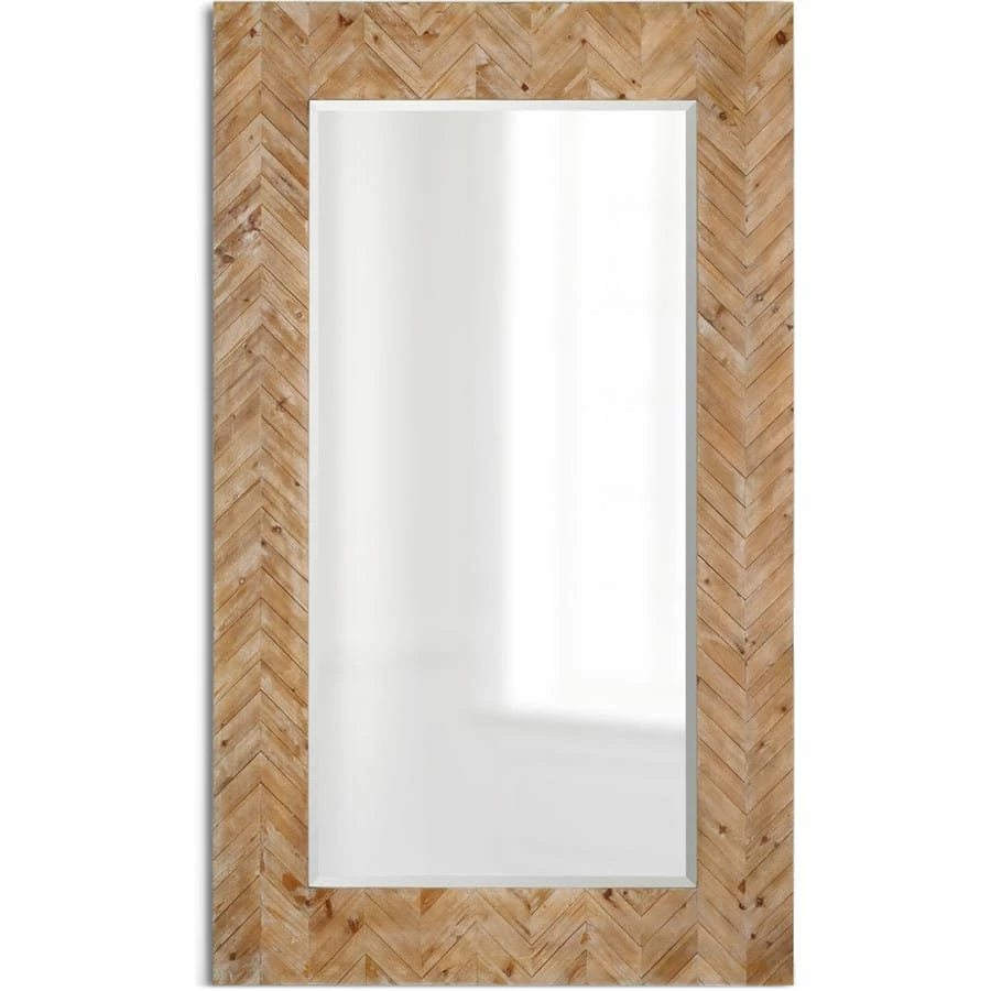 This stately mirror features a chevron patterned, solid wood frame finished with a light gray glaze. Mirror has a generous 1 1/4″ bevel.