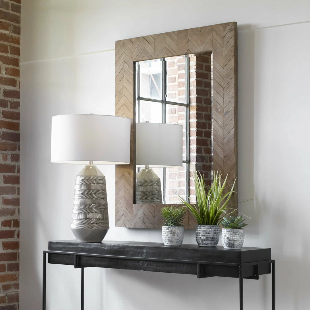 This mirror features a chevron patterned, natural pine wood frame finished with a light gray glaze. Mirror has a generous 1 1/4″ bevel.