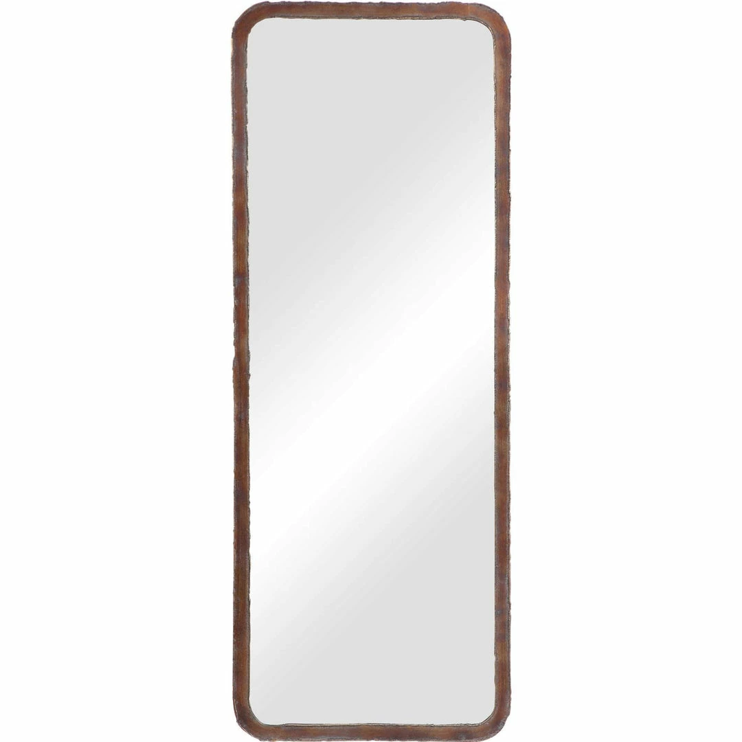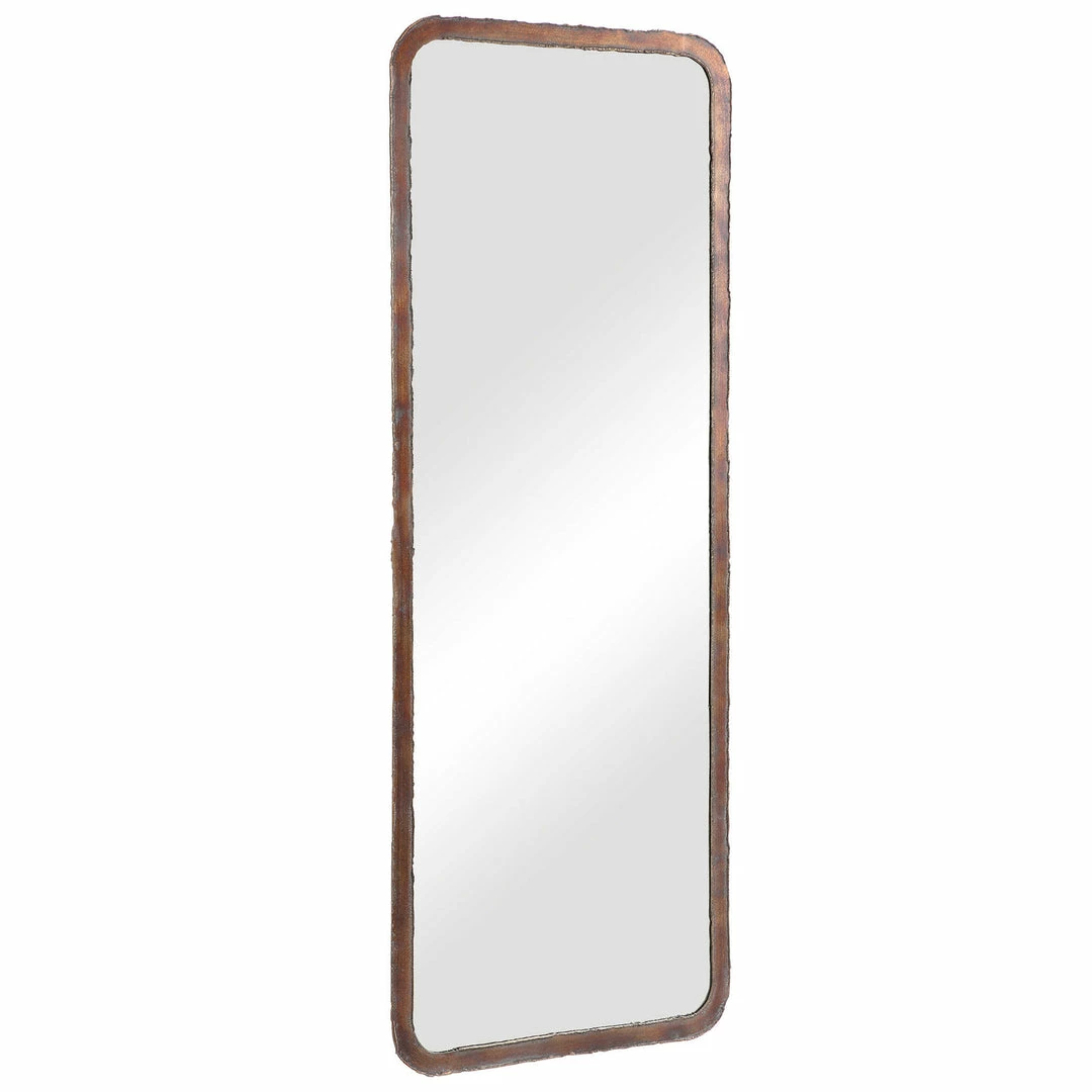Featuring a hand forged iron construction, this rustic mirror design is finished in oxidized copper bronze with a continuous weld bead edge.
