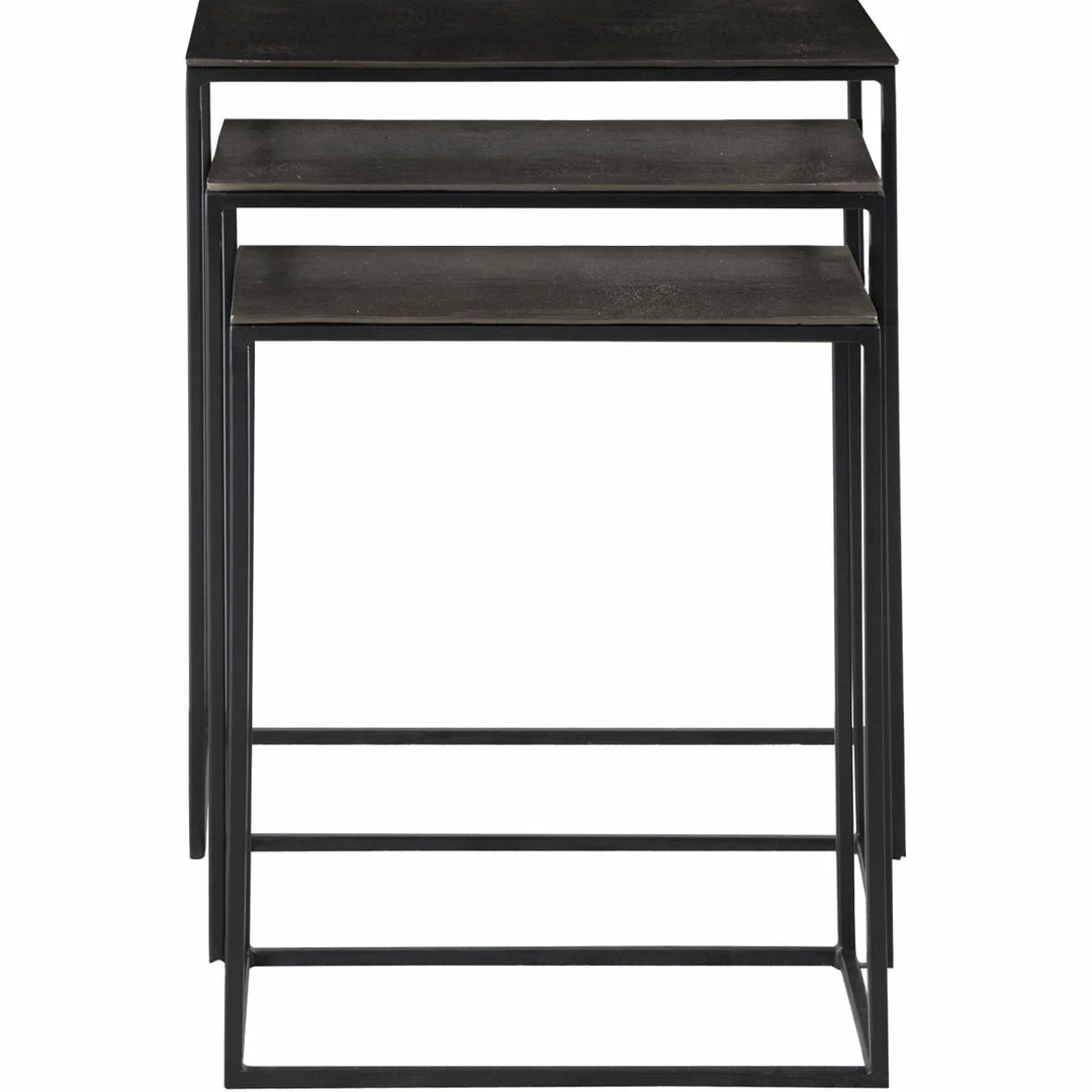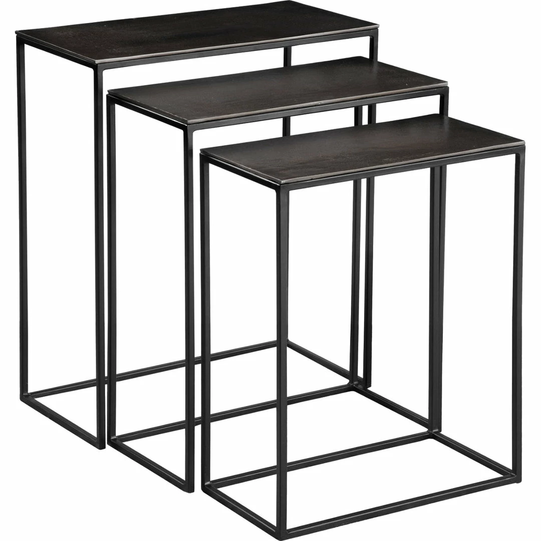 Three functional nesting tables constructed in an aged black iron, featuring a cast textured metallic aluminum slab top.